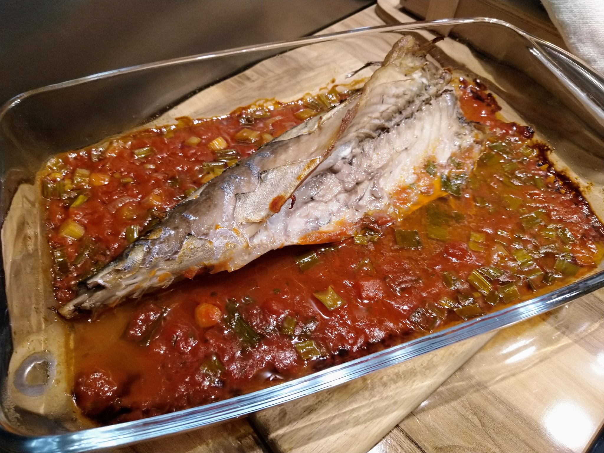 Печена прясна скумрия с готов сос арабиата и пресен лук