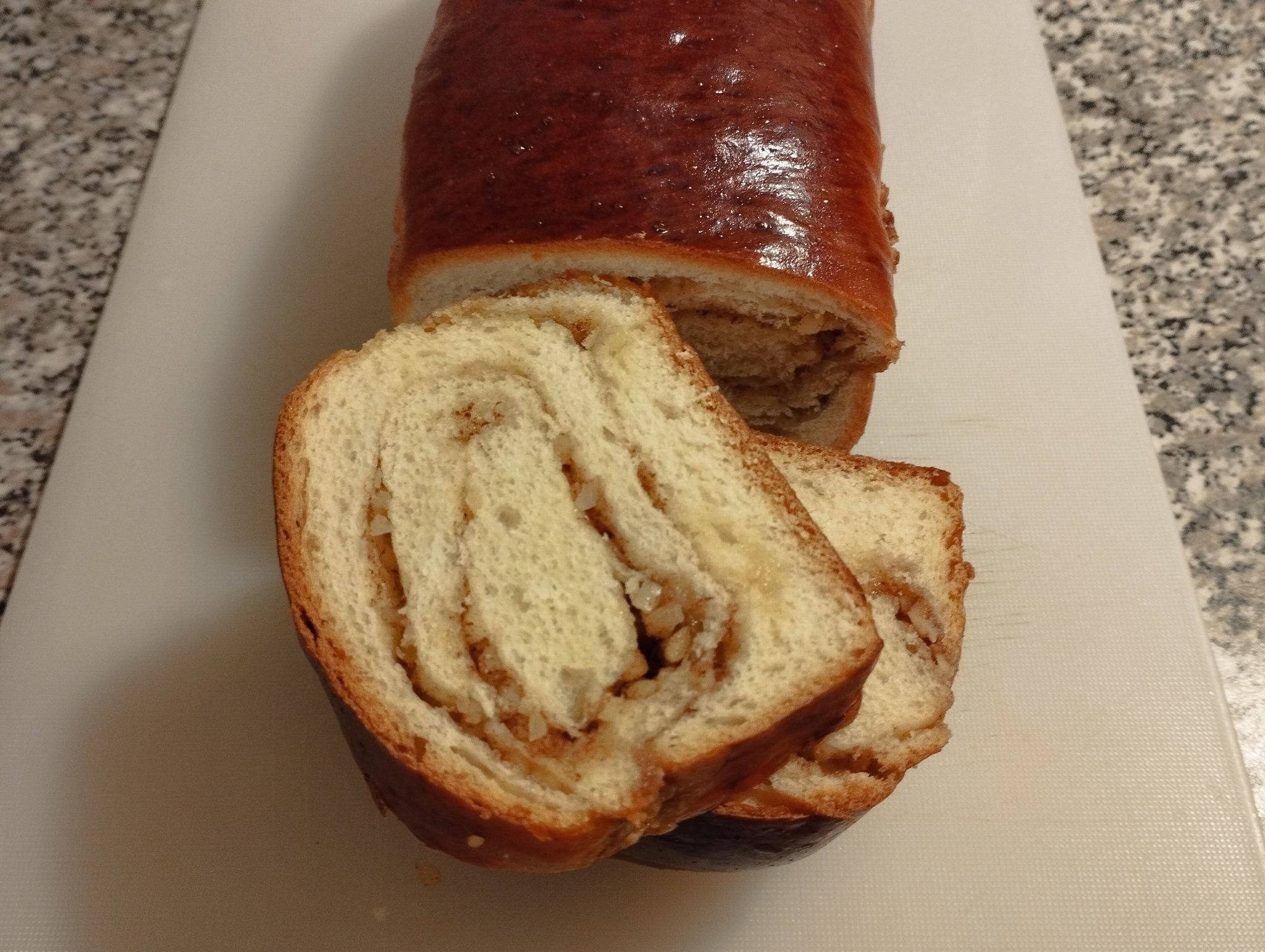 пълнеж: 1ч л. канела, 4-5 с.л.кафява захар, 50 г меко масло, +-счукани ядки - мекото масло се смесва с канелата и захарта и се разпределя върху тестото.