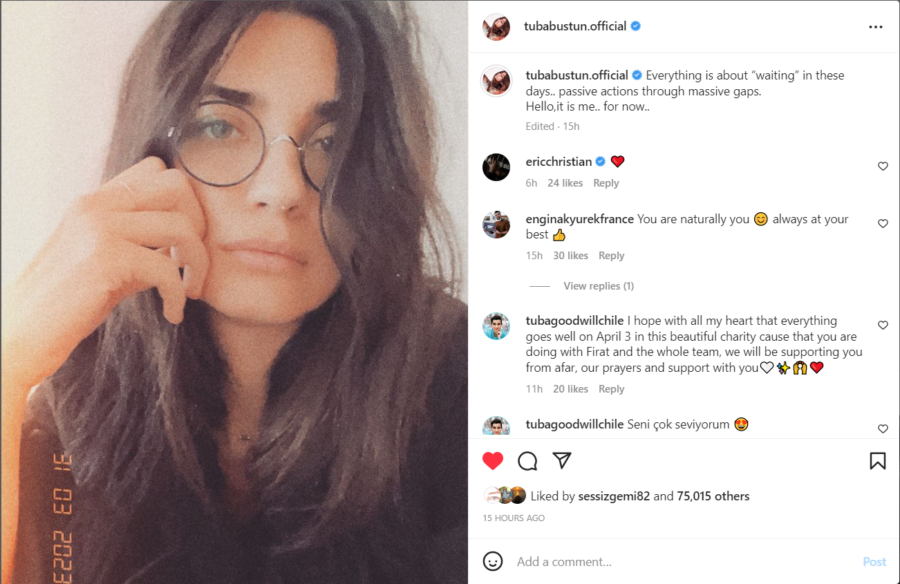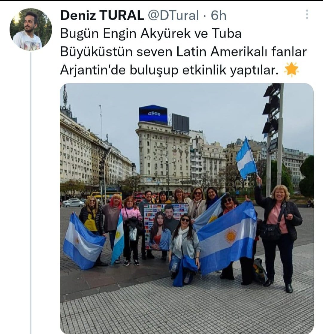 Тази вечер ще бъде много специална и значима вечер за вас и за нас. Изпращам ти моите безкрайни поздравления за този път, по който си тръгнала със сърцето си. Надявам се, че тези красоти ще се върнат при теб в замяна. Аз, и сърцата, и умовете на всички твои фенове сме с теб. Радвам се, че го имаш, обичам те толкова много #TubaBüyüküstün