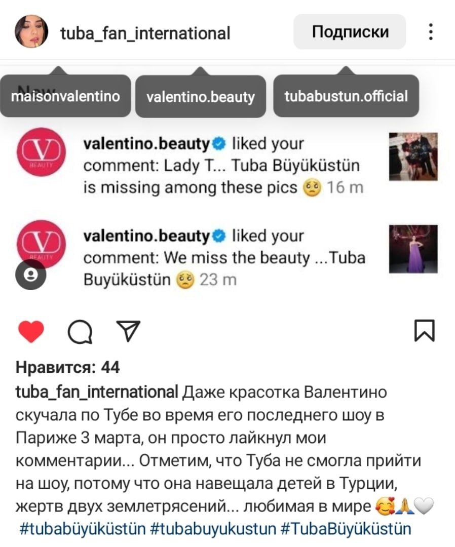 Оказва се, че екипът на Валентино са поканили Туба на пролетното дефиле, но тя явно е отказала - беше в Турция с децата и посети децата от засегнатите от земетресението райони.