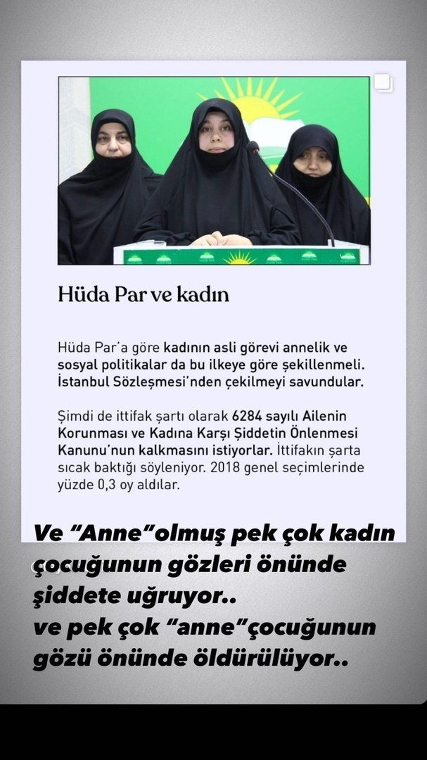 По словам Хюды Пар, главная обязанность женщины - материнство, и социальная политика должна строиться в соответствии с этим принципом. Они выступали за выход из Стамбульской конвенции. Теперь, когда альянс завершил свою работу, защита семьи и предотвращение насилия в отношении женщин № 6284 На всеобщих выборах 2018 года они получили 0,3 процента голосов.