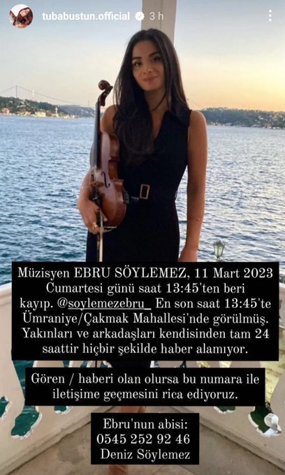 Музикантът EBRU SOYLEMEZ е в неизвестност от 13:45 ч. в събота, 11 март 2023 г.  @Soylemezebru_