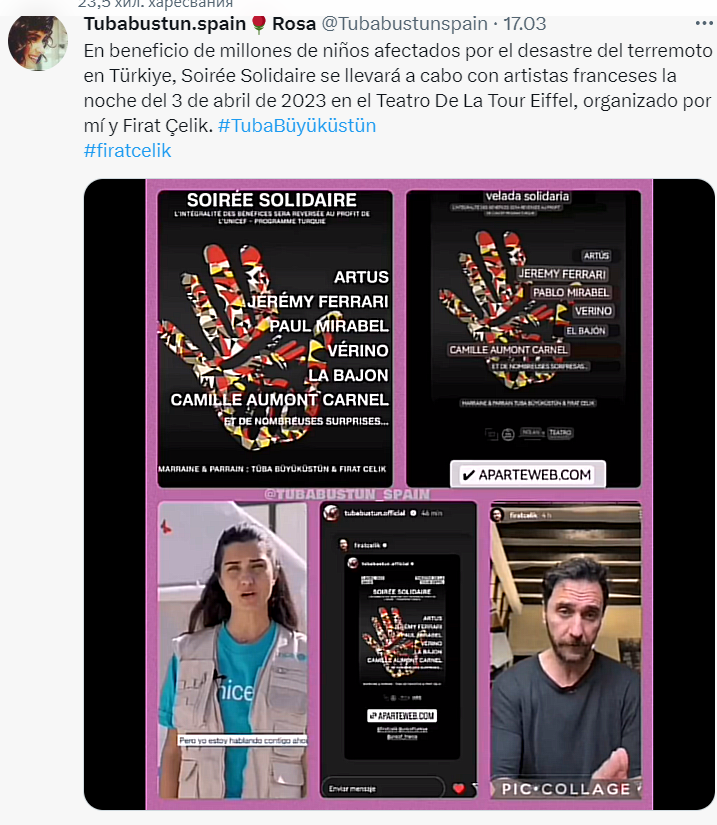 Tuba Büyüküstün и Fırat Çelik организират благотворителна вечер във Франция за пострадалите от земетресението деца след опустошителните земетресения, засегнали 11 провинции с център Кахраманмараш, които задушиха страната ни. Беше заявено, че всички пари, които трябва да бъдат събрани, ще бъдат преведени на УНИЦЕФ Турция.
