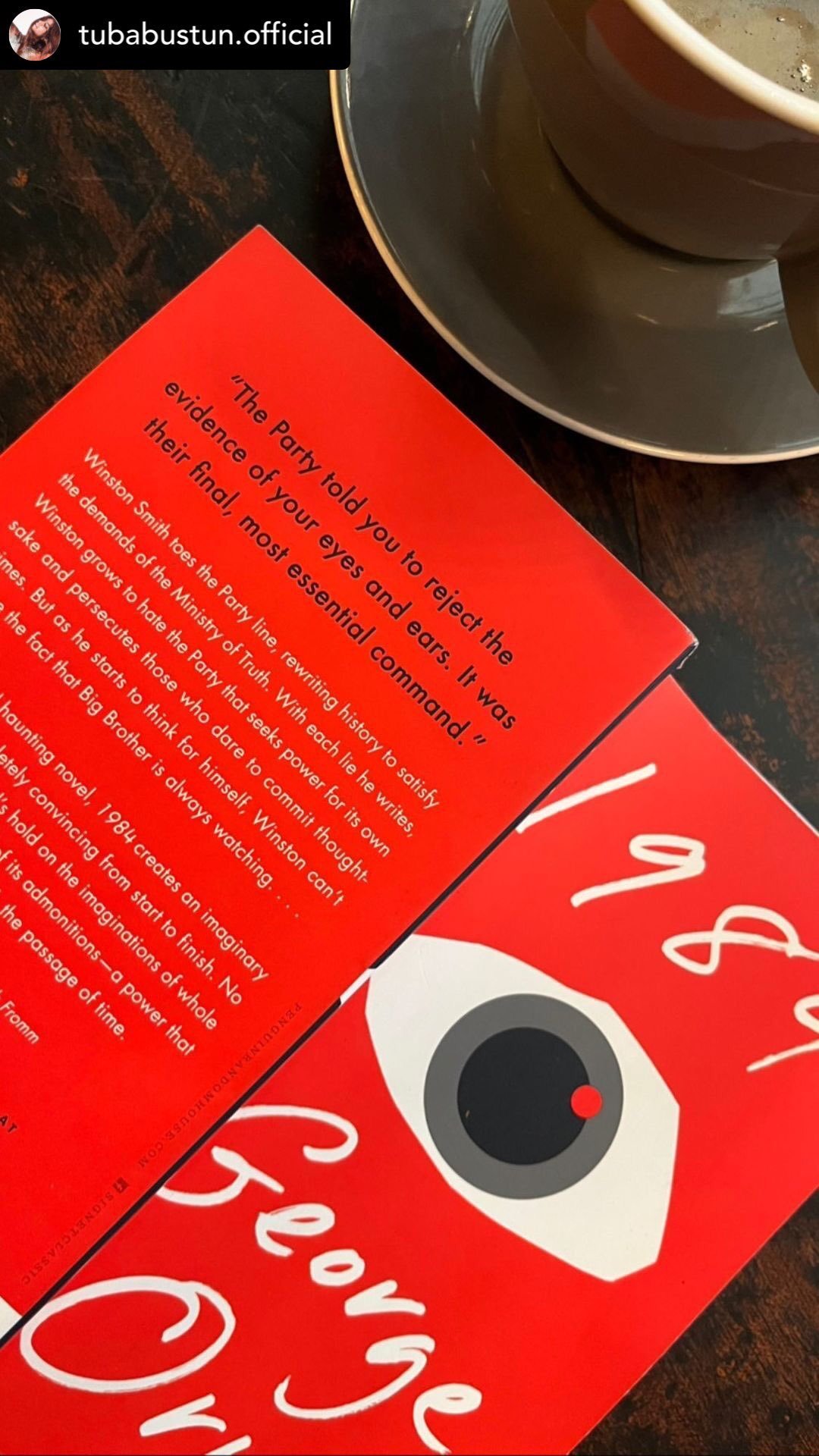 Туба ни е сложила откъс от книгата 1984 на Оруел , която явно чете и чаша кафе. Надявам се, че се върна вече към ежедневието си от преди земетресението.