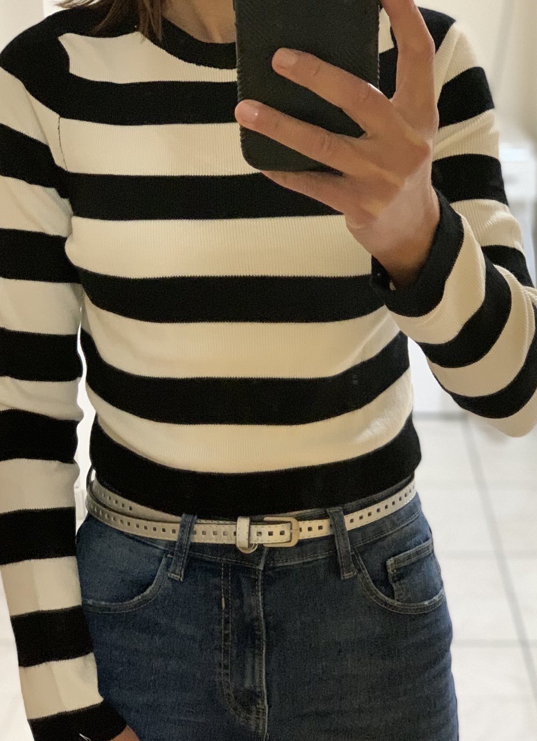 А ето как стои М от райето , едва съм я вкарала в дънките, като се има предвид , че са с много висока талия. Ръкавите са дълги , но по торса е ОК. Иначе е много хубава материя- плътна и стегната.