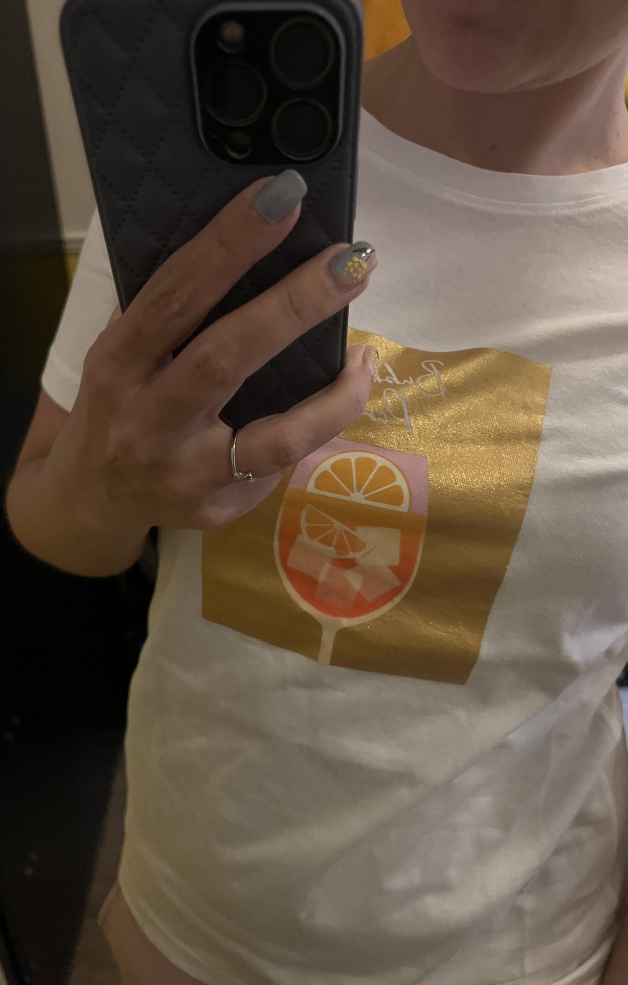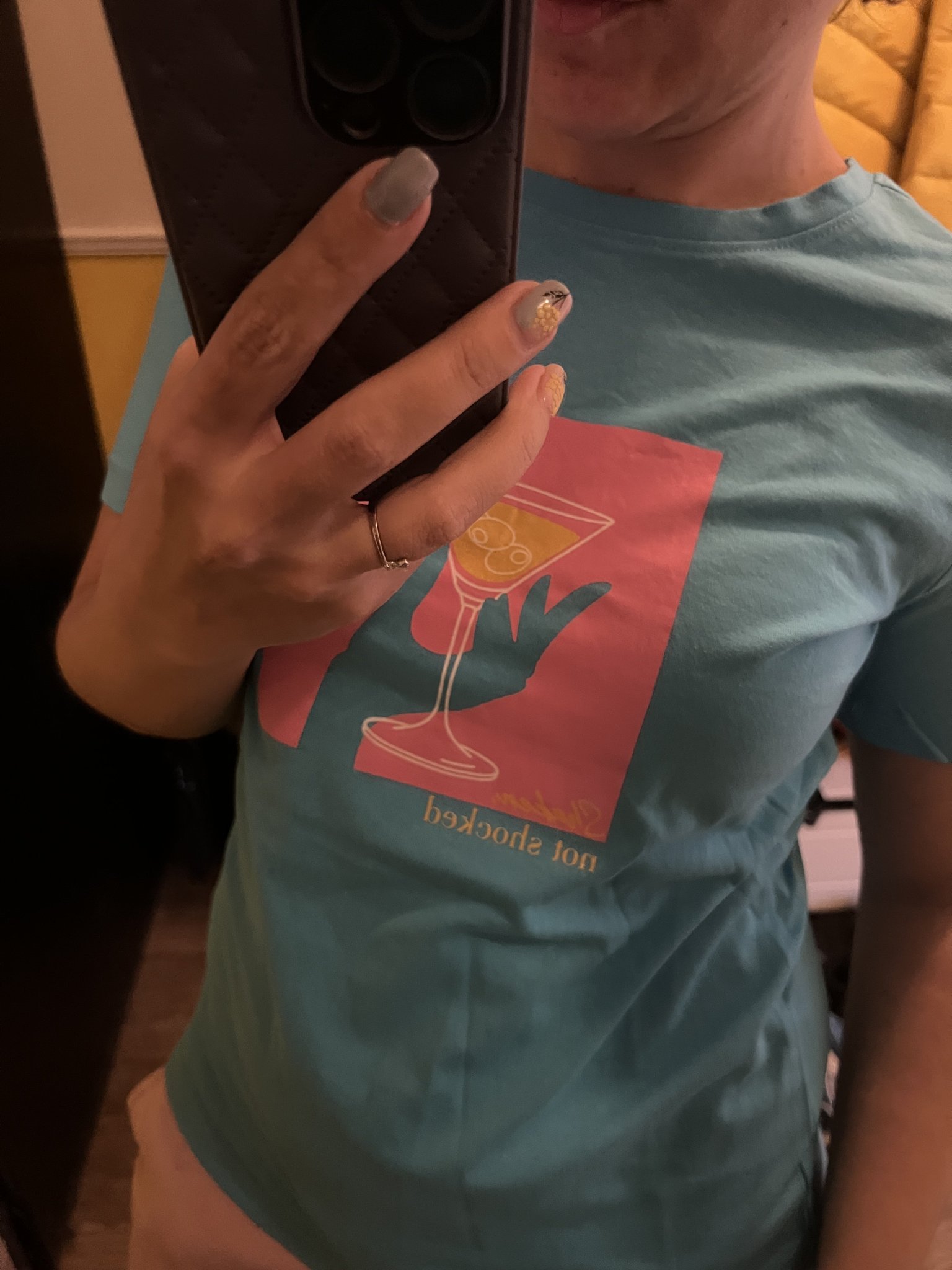 Блузата с къс ръкав стои някак странно избеляла там, където е шевът на бието.