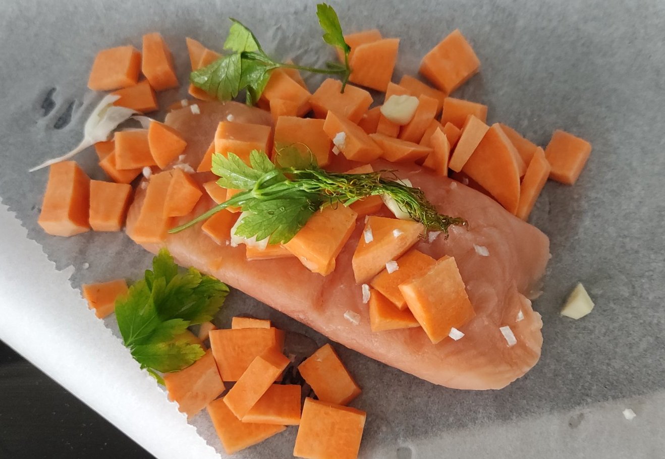 Днес дадох сьомга. Трябваше да е с гарнитура сладък картоф, но не съобразих, че няма да се сготви по едно и също време с рибата и си му чопвах по малко и давах да папка без нищо, гола риба Flushed Smile