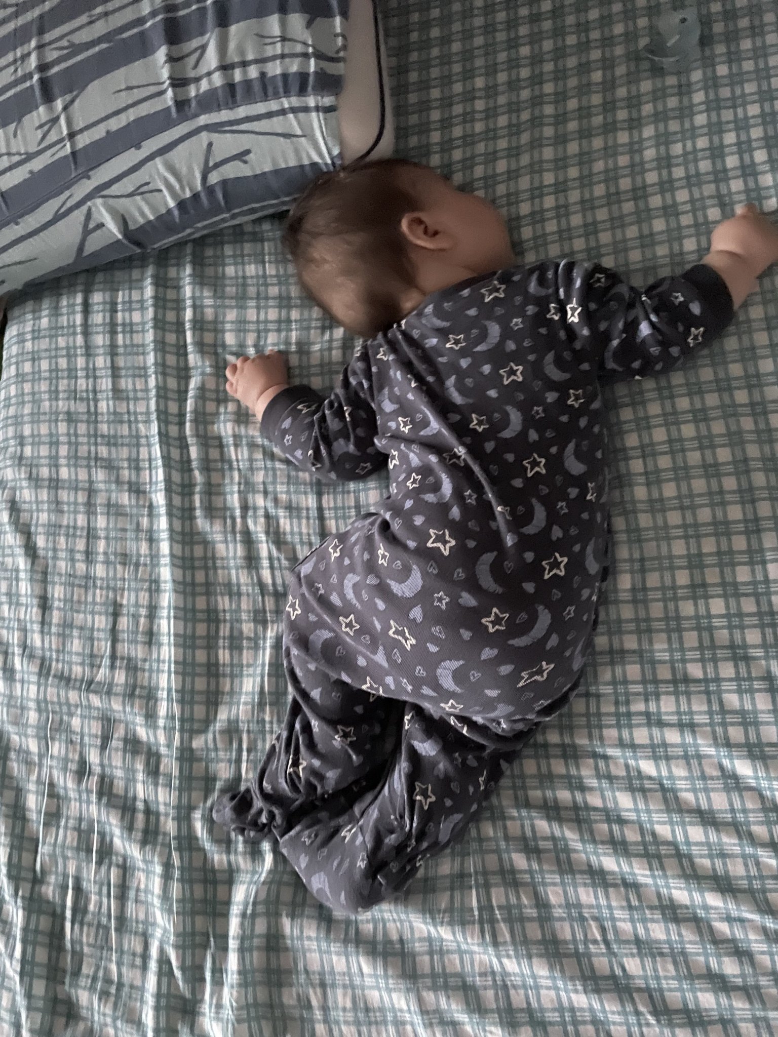 Миша като спи на спалнята, спи по гръб. Така е от както е роден. Обаче сложа ли го в неговото легло се обръща кьм мен на една страна. Всичко е ок, но нощеска се опика 2 пъти. Памперсите не издържат странично спане. Сутринта го взех при мен, обърна се с гръб към мен и спа до 8, което е рекорд за последните седмици. Дано се повтори 😂