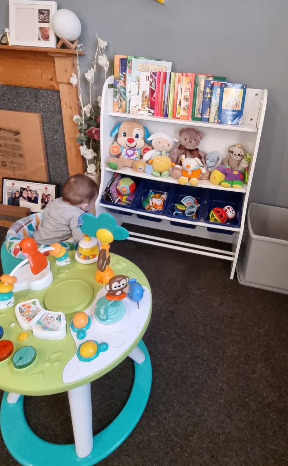 Определено пълзя яко, и постоянно някъде съм с него да го държа, пазя, помагам. На шкафове, по вратите стоим, по перални сушилни вадим слагаме играчки вътре, разглеждаме врати снимки, книги. Голям кеф е да събори цялото това нещо, книги по книга и играчка по играчка,кутиите и аз го държа.