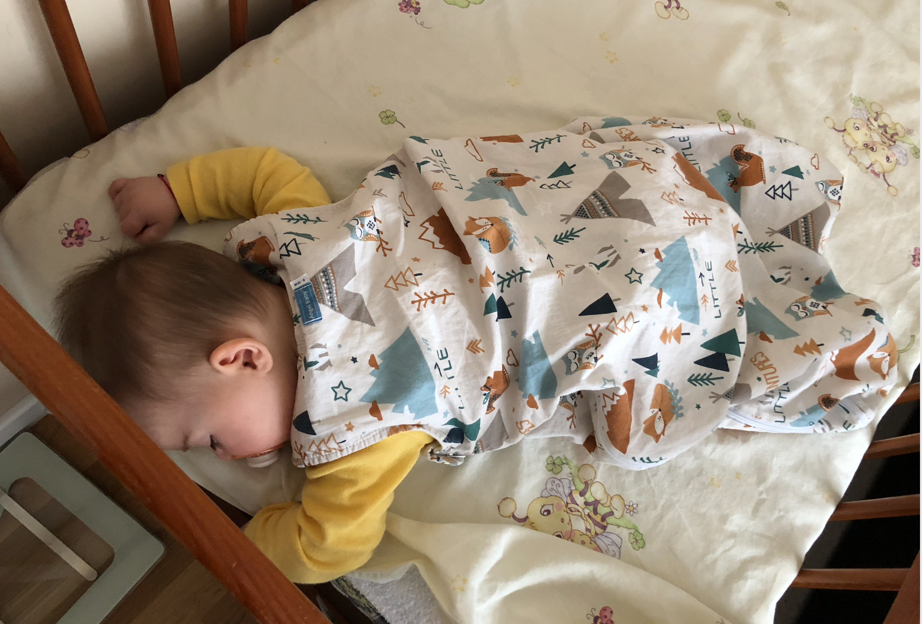 Позата за сън е на една страна, от нея понякога се обръща по корем и явно в просъница не съумява да се обърне и започва да мрънка, съответно аз ставам обръщам я ѝ пак лягам. Вече поне става по веднъж на нощ, но се надявам и за него мляко да спре да става. Спи с цяло чувалче, по- голямо за да ѝ е свободно, но като се върти и цялото го намотава около себе си.