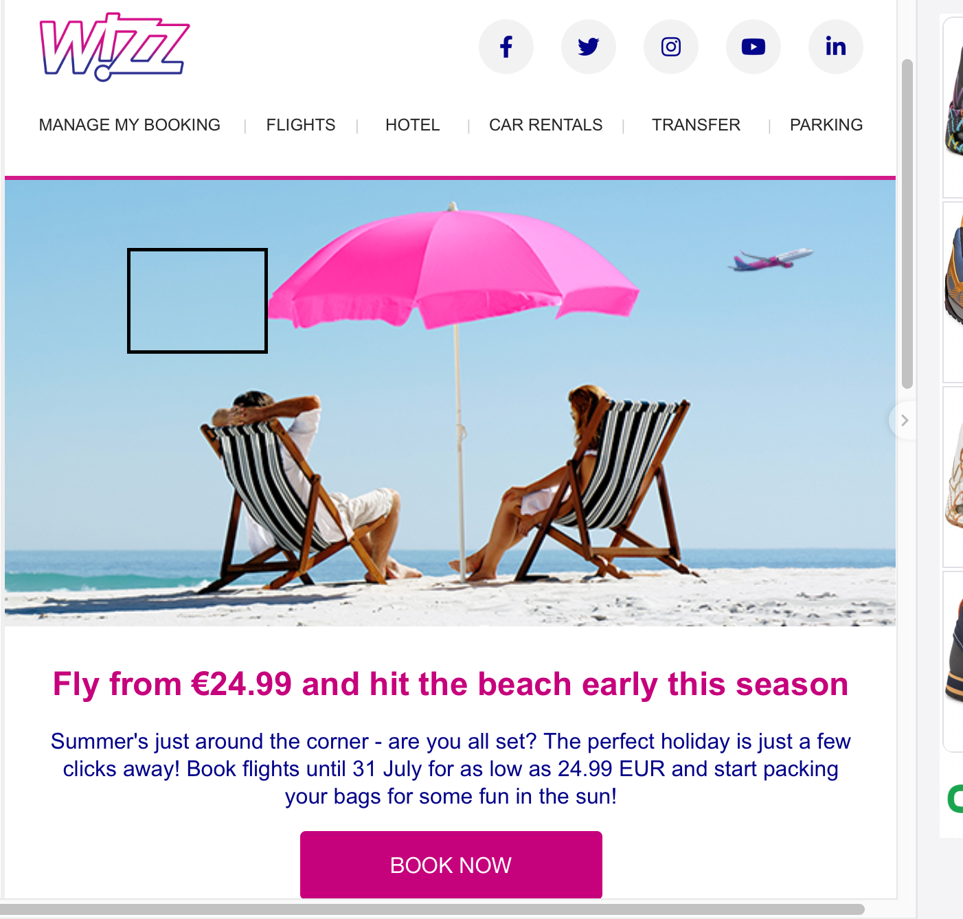 The promotion applies to selected flights and is subject to availability. One way price, including administration fee. One carry-on bag (max: 40x30x20cm) is included. Trolley bag and each piece of checked-in baggage is subject to additional fees. The price applies only to bookings made on wizzair.com and the WIZZ mobile app. Number of seats at indicated prices are limited. The 24.99 EUR price applies on 10 May 2023 from 00.00 till 23.59 CEST for selected flights departing before 31 July 2023.