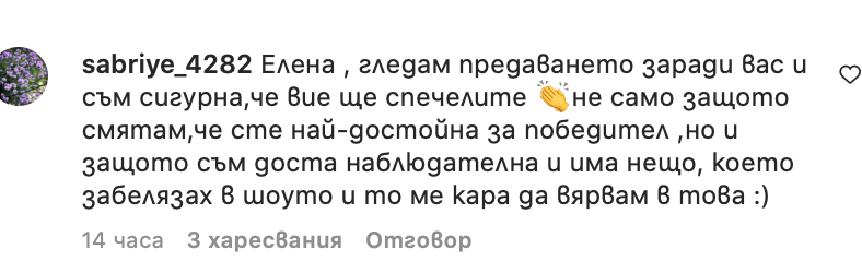 Коментар в инстаграма на Елена, на който тя е сложила сърчице