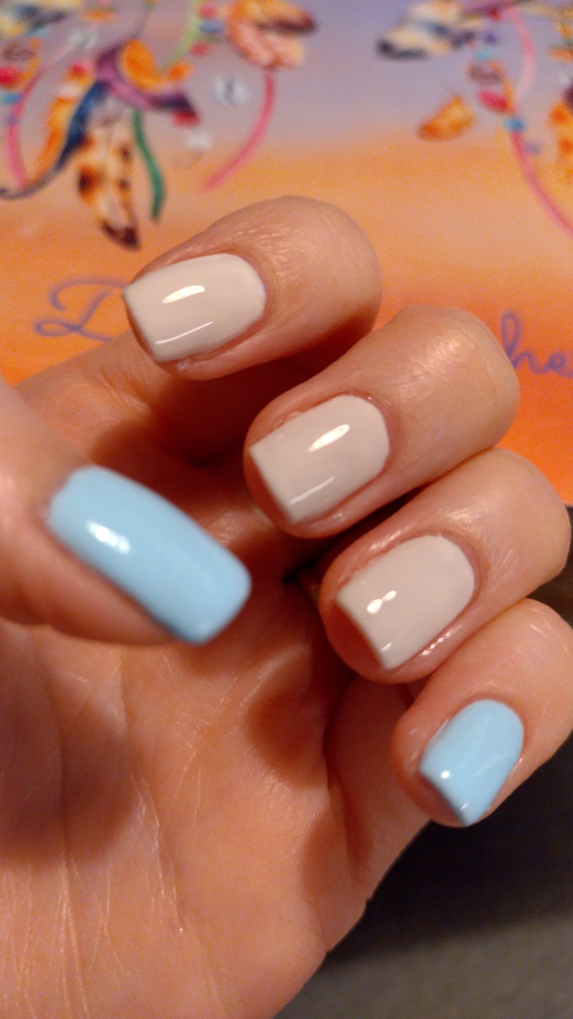 Лаковете са Silcare (синьото) и PNB (бялото). Първия ми хареса много повече, плътен цвят, удобна четка, ще ги имам предвид занапред. Това са ми двата единствени лака всъщност. Трябваше да са бяло и нюд, но и така стават.
