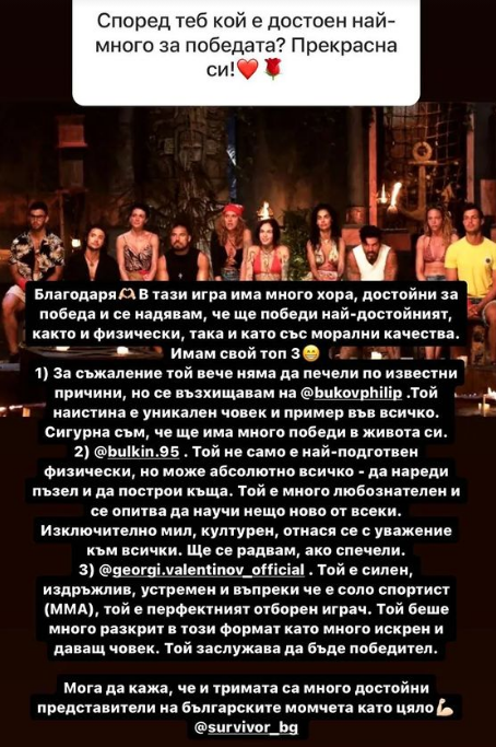 Моля ви хора, искате да убиете хубавото момче Филип ли, че го пращате в ЕргентОт. Божана и Георги хитро насадиха разкол в племето на сините, като противопоставиха мъже срещу жени. Светльо много бързо се върза, и набързо отписа отбора си , щото го държи гладничък несправедливо . Никаква мъжесвеност и отстояване не виждам в него, много е далеч от лидер , просто не харесва съотборниците си Яд ме е за Александра.