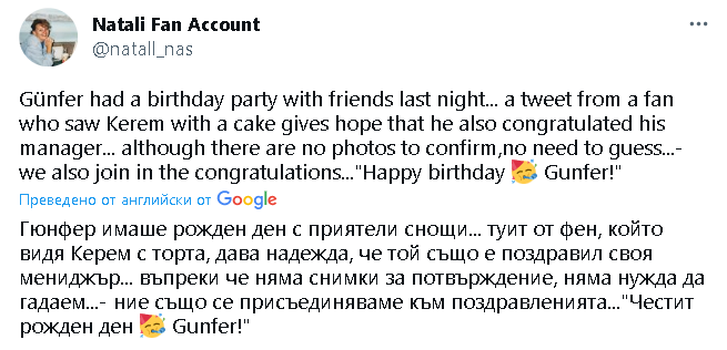 Вчера мениджърката на Керем, Гюнфер е празнувала рожден ден. Аз не вярвам той лично да е присъствал, но знаели човек...