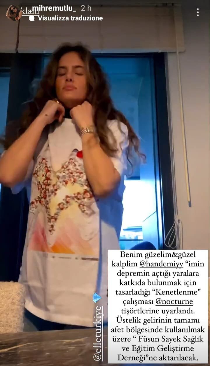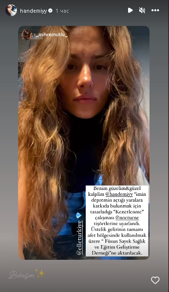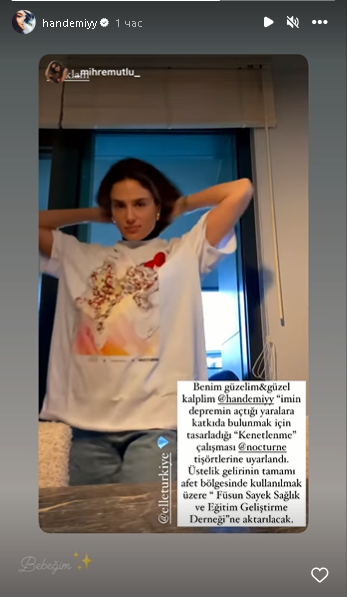 "Взаимната работа, проектирана от моята красива скъпа @handemiyy, за да допринесе за раните, причинени от земетресението, е адаптирана към тениските с Ноктюрно. Освен това всичките приходи от нея ще бъдат прехвърлени на „Асоциацията за развитие на здравето и образованието на Füsun Sayek“, за да се използва в района на бедствието."