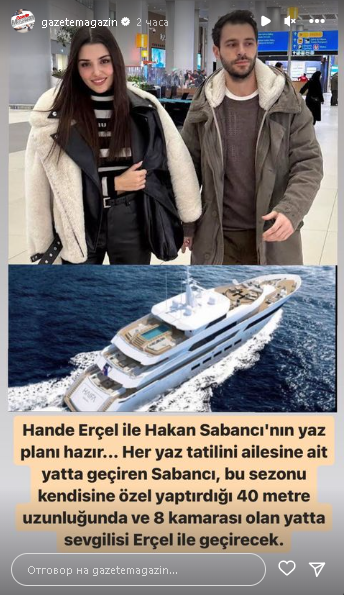 "Летният план на Ханде Ерчел и Хакан Сабанджъ е готов...  Сабанджъ, който прекарва всяка лятна ваканция на яхтата принадлежаща на семейството му, ще прекара този сезон с любовницата си Ерчел на 40-метровата яхта с 8 кабини, която той специално построи за нея ".