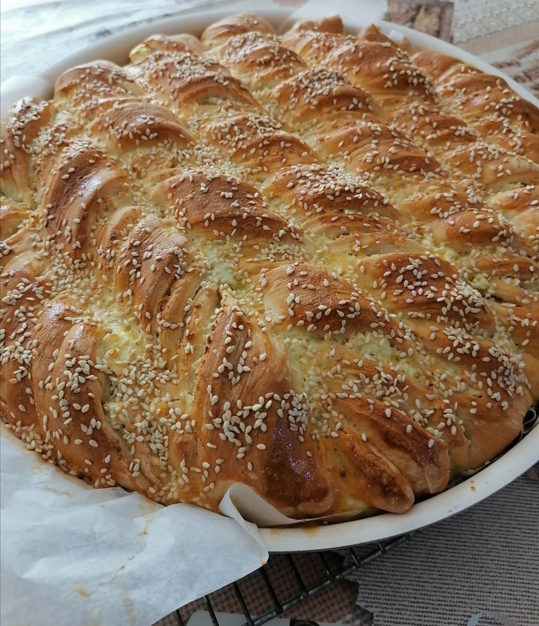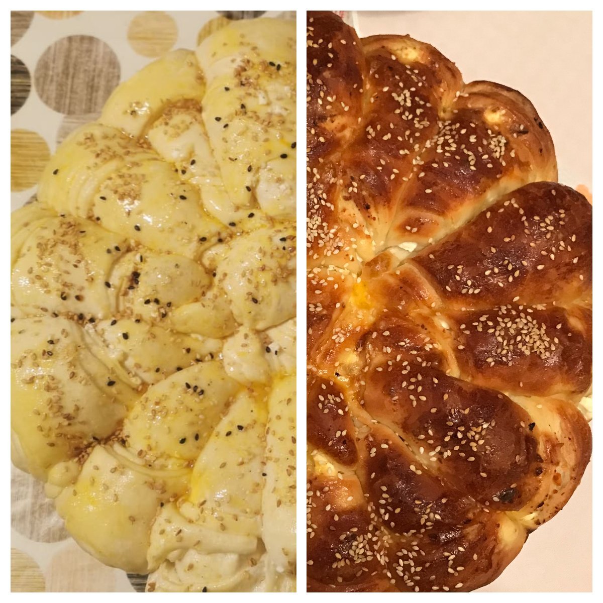 Всяка кора, намазвам с разтопено краве масло и поръсвам със сирене. Поставям една върху друга. Разрязвам на 7 ленти, усуквам и поставям във форма за печене , покрита с хартия за печене.