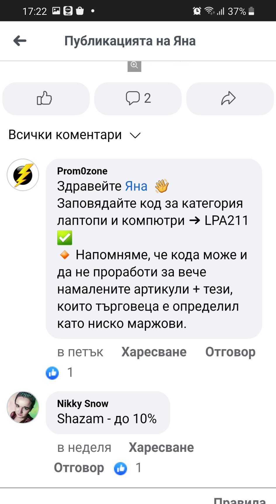 Привет. Ще съм благодарна за код за Ardes, Ozone или Зора. Става дума за покупка на лаптоп. Благодаря!