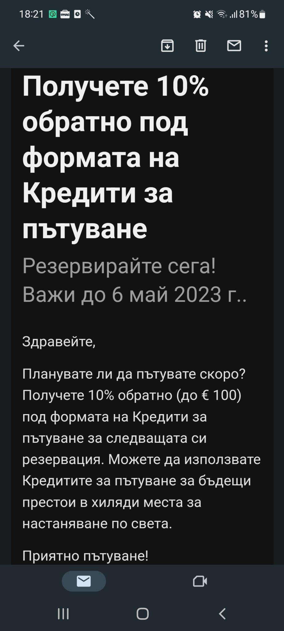 Подарявам код за букинг, валиден до утре. 10% под формата на кредити. На лично