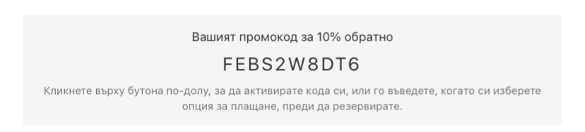 Пак имам код за booking. Вашият промокод за 10% обратно: