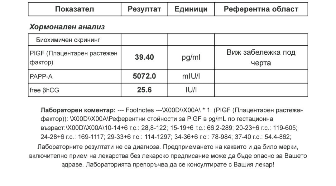 Това в Пловдив ли е правено? Папп-а е в норма, чхг трябва да е в хиляди? В см, не са дали нещо правилната единица в скоби. Като цяло интерпретацията е когато е дадено като част от медианата (МоМ), но това е с кръстосани резултати от УЗ измерването.