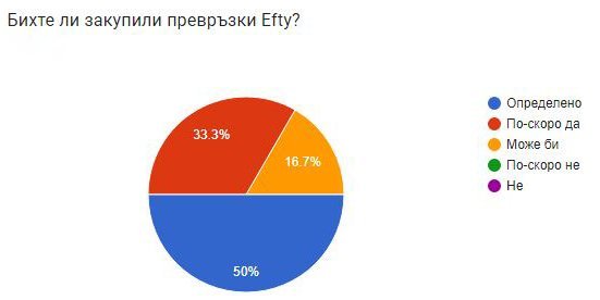 На въпроса "Бихте ли закупи превръзки Efty?" 83,3% отговарят с най-висока степен на категоричност (50% - "Определено" и 33,3% - "По-скоро да").
