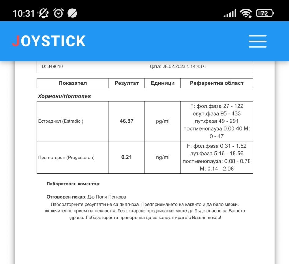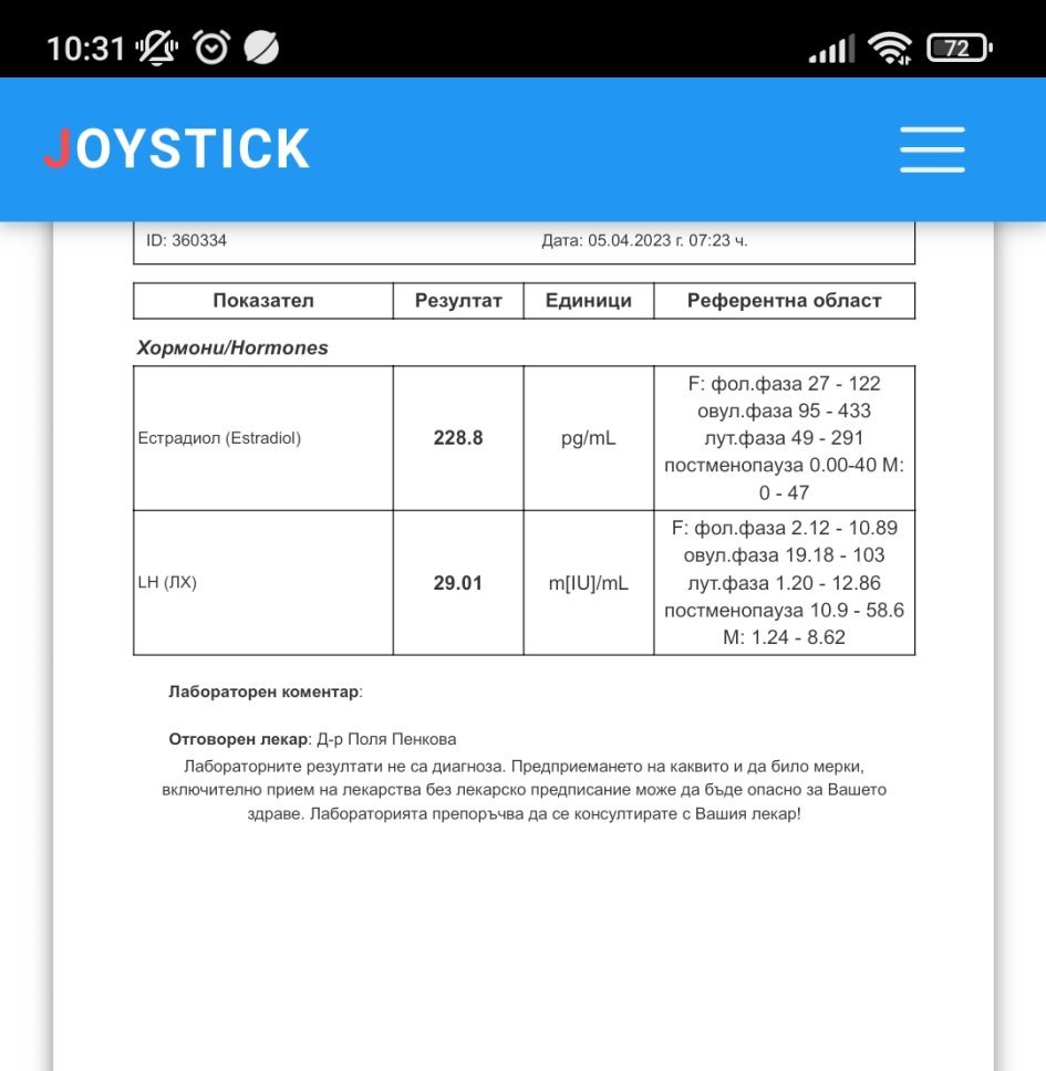 Седя си аз и чакам ред за преглед и да си видя хормоните и.... Не съм сигурна какво означава, знам, че би било редно да коментирам с Доки, но ще полудея, докато дойде моя ред, днес ми е 10 ден от стимулацията и 11 от МЦ