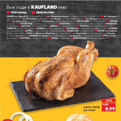 Ето за пилето от грил щанда, което би трябвало да е извън магазина. На снимката са изброени в кои градове има.