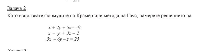 Здравейте, може ли помощ? Задачата е първи курс линейна алгебра. Решавам я като система, но не ми се получава по Крамер. Отговорите са (2; - 3; - 1)