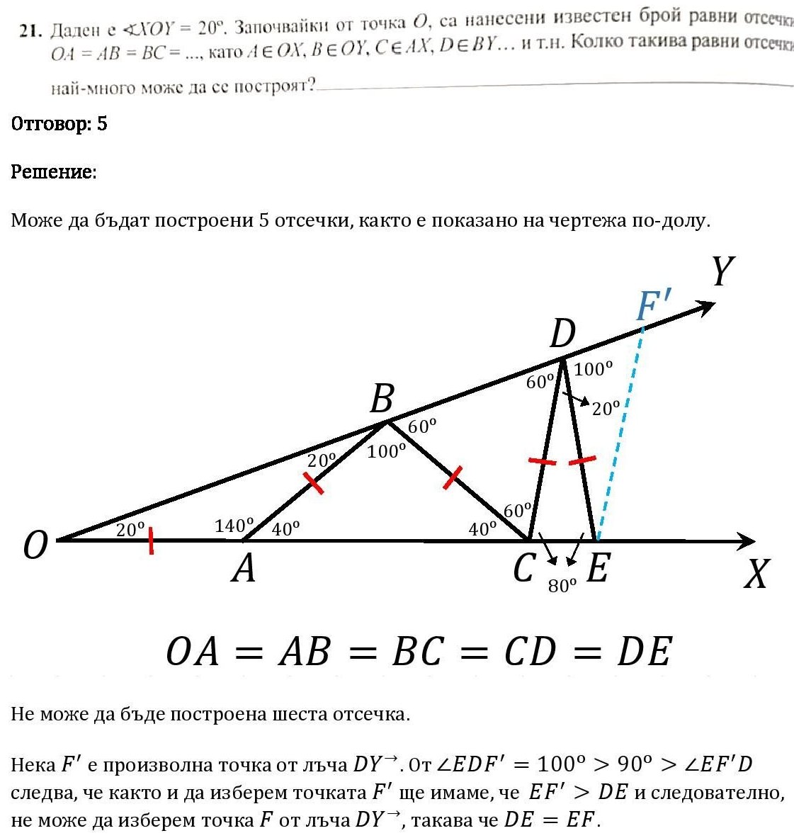Започнете да слагате точките по рамената... Първия равнобедрен триъгълник е с ъгли при основата 20 градуса (тр.ОАВ), следващия е с ъгли при основата 400 (АВ=АС), следващия със 600 (ъг АВС=180-2*40, ъг СВD=180-20-100=600 , ВС=СD), следващия триъгълник с ъгъл при основата 800 (ъг DCE=180-60-40=800 и CD=DE) и следва, че ъгъл EDY=180-20-60=100 и не можем да направим равнобедрен триъгълник с ъгъл при основата >900Не мога сега да прикача чертеж, но като си го направите и започнете с ъглите, ще се види идеята...