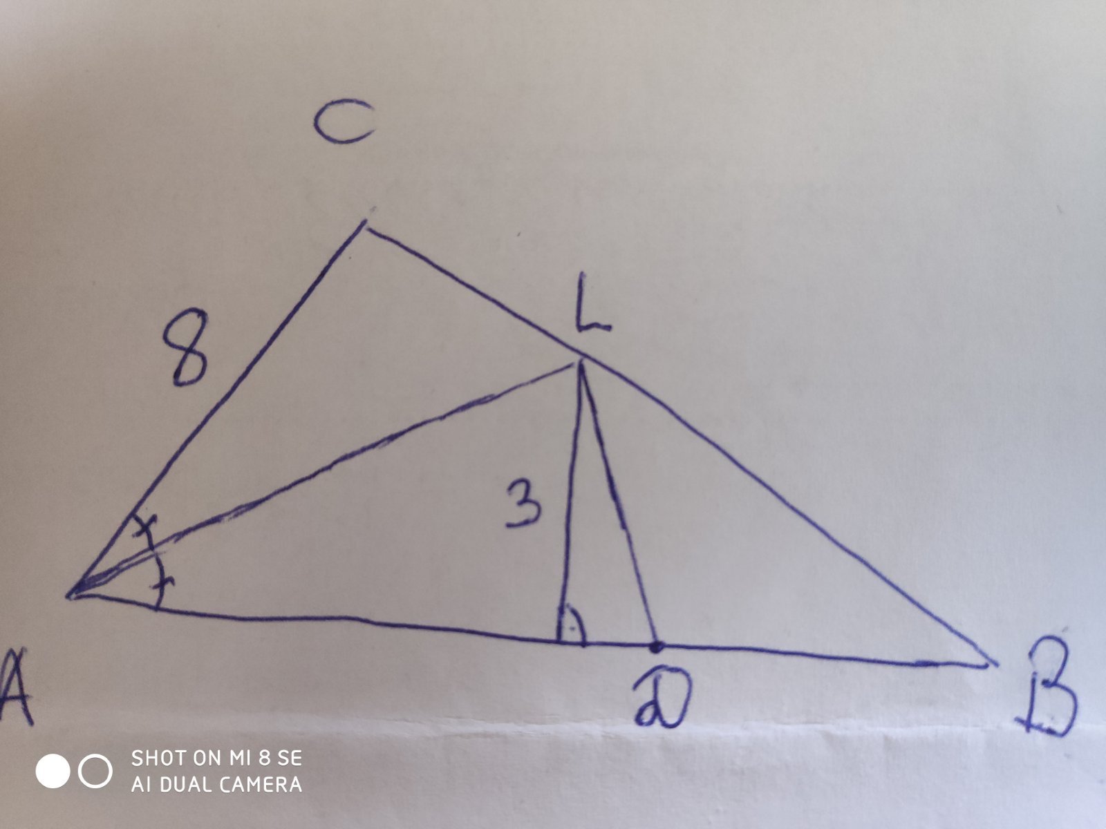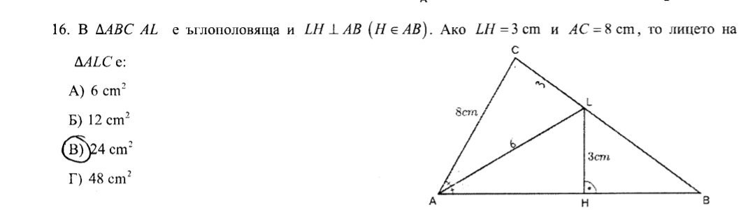 Здравейте, нека върху АВ построим точка D, така че АС = AD и да построим триъгълник ADL. Тогава триъгълници ACL и ADL са еднакви по 1-ви признак (AL - обща, AC=AD и ъгли CAL и DAL са равни защото AL е  ъглополовяща), следователно лицата им също са равни. Тогава лицето S=(8x3)/2=12