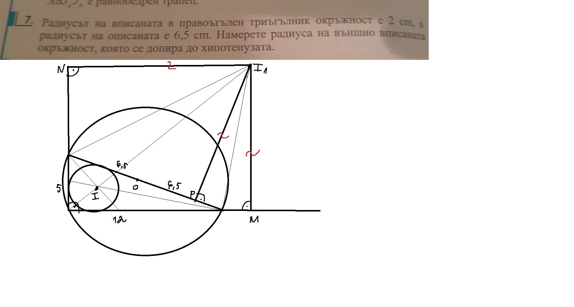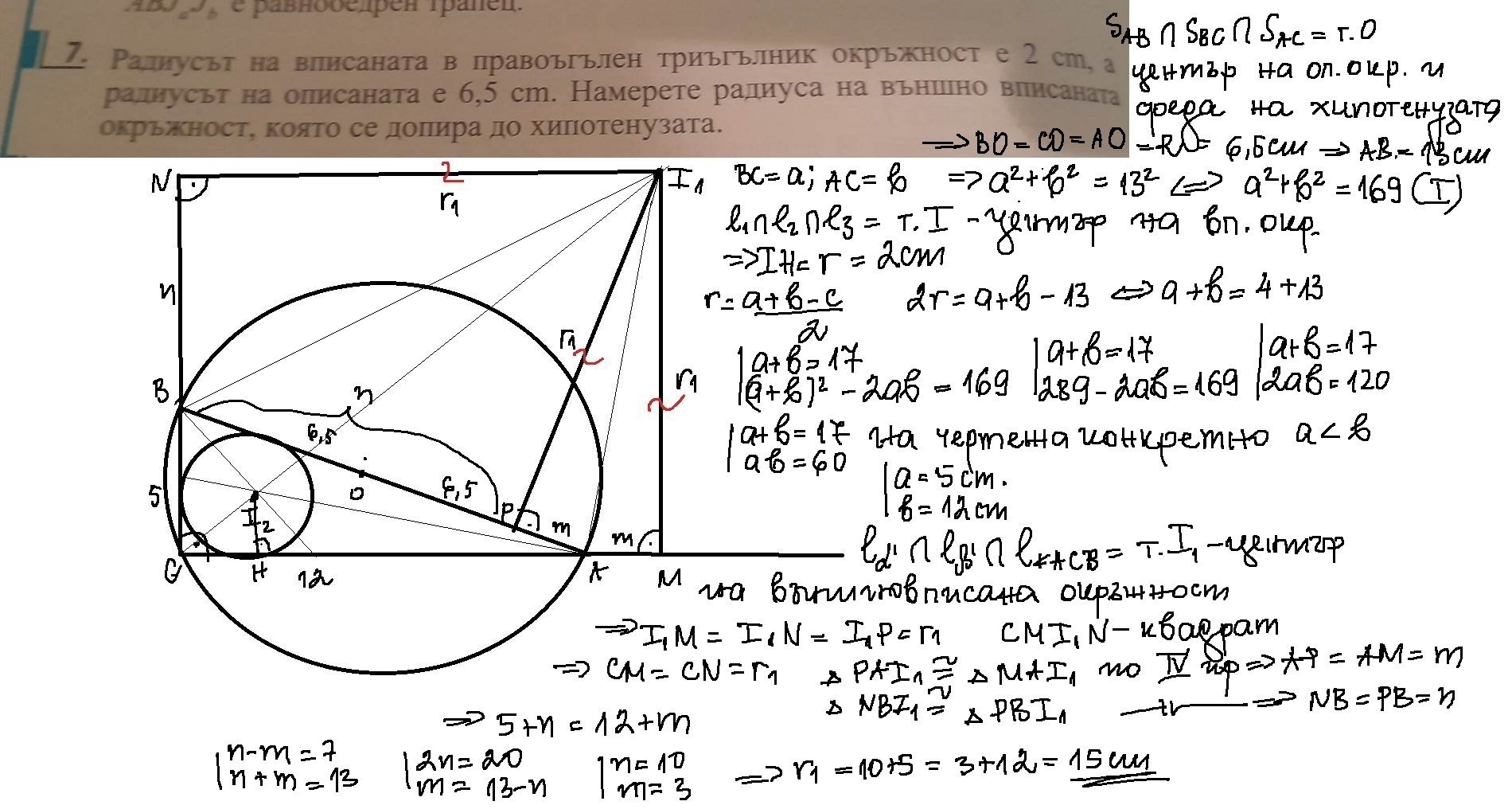 Доста непрецизно за чертеж, но като идея става.. Трябва със система да намерите двата катета.  Едното уравнение в нея нека е Питагорова теорема, а  другото - формулата за радиус на вписана в правоъгълен триъгълник окръжност. Оттам вече е по-лесно. Ако не се получи, кажете.