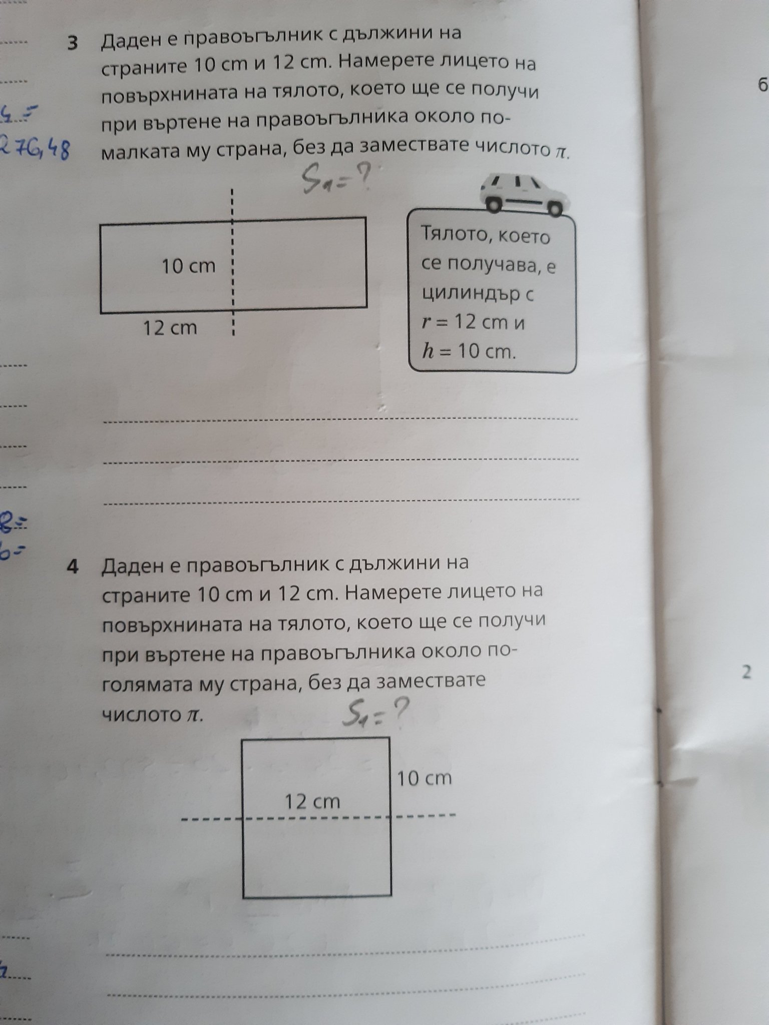При ротация на правоъгълник по ос успоредна на страна се получава цилиндър с височина тази страна и радиус на основата, който зависи от мястото на  тази ос - в случая е в средата на страната, значи радиуса е 1/2 от нея.