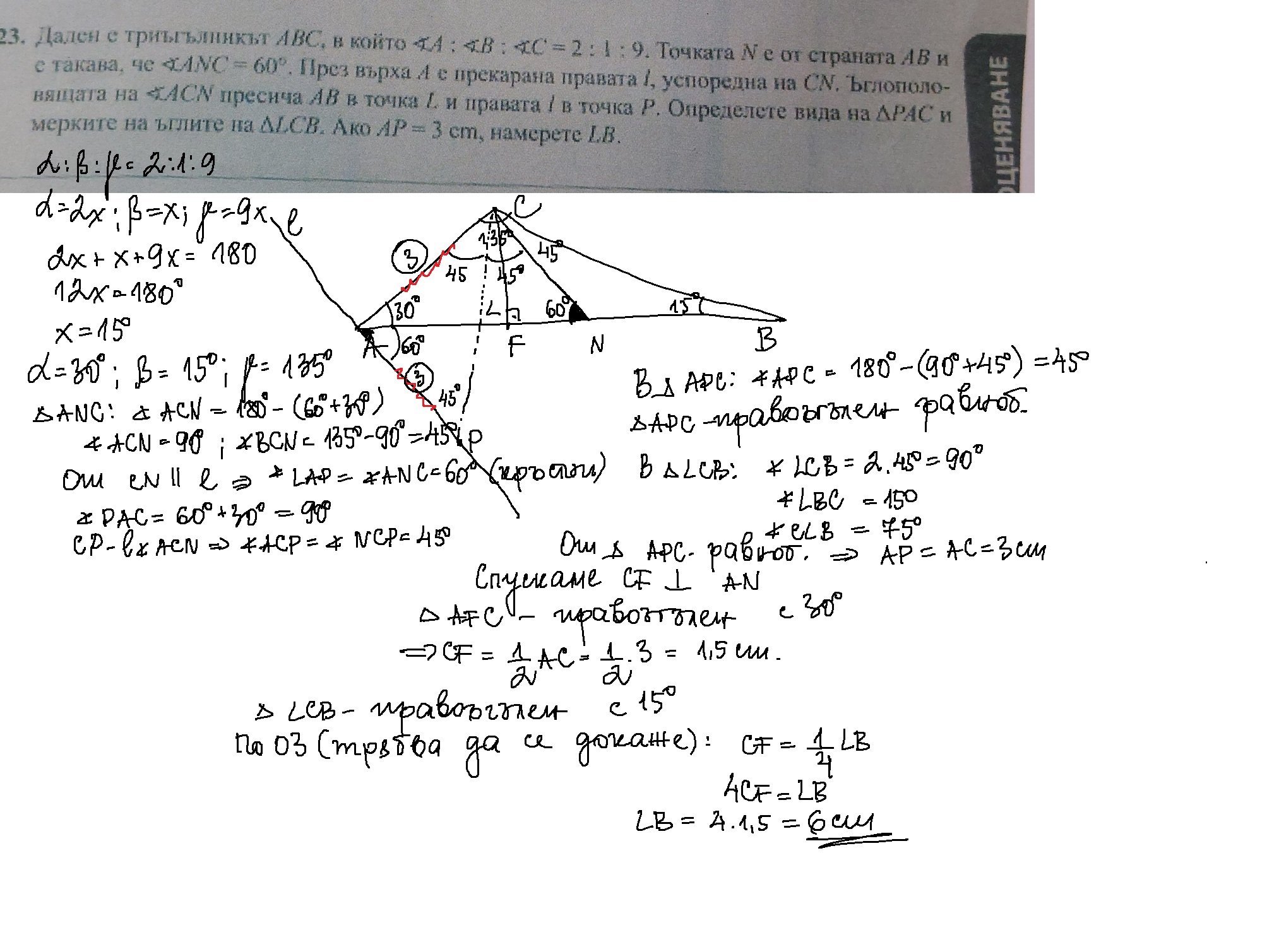 Правата от ъгъл С към АВ образува ъгъл от 60°, от другата страна за ВNC остават 120°, знаем, че ъгъл В е 15, значи NCB  е 45°. В такъв случай, ъглополовящата ще раздели на по 45° ъгъл NCA. Понеже правата, която минава през ъгъл А сключва 90° остава ъгъл Р да е и той 45°, т.е триъгълникът е равнобедрен и АС=АР= 3см.