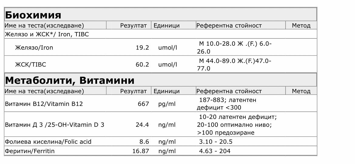 Пуснах си и пакет Анемия, а там пък феритина е доста нисък, което означава, че ще се наложи прием на желязо.