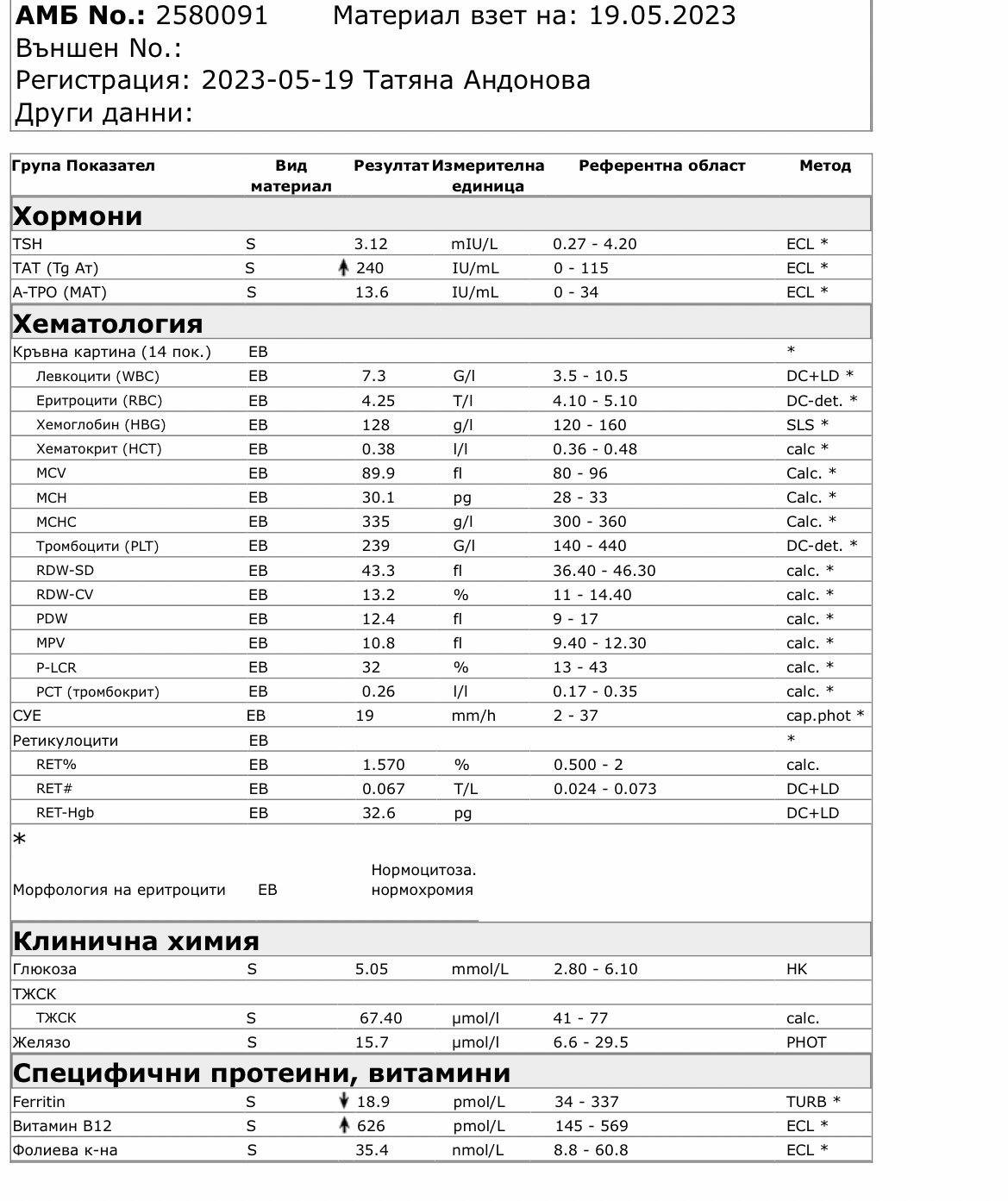 По съвет на съфорумка реших да направя изследване на ТАТ и МАТ, но по ред причини едва днес успях да отида и резултата е много високи нива на ТАТ, аз съм в лек шок … има и лека разлика в стойностите на TSH.