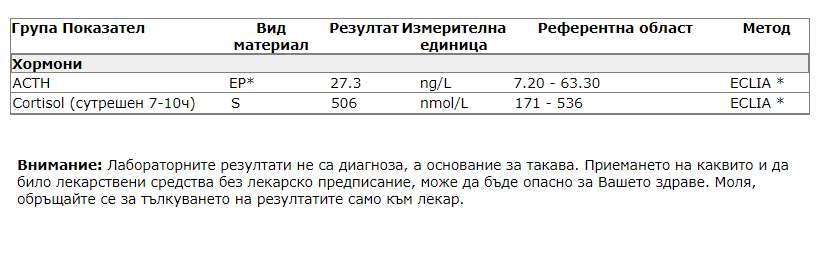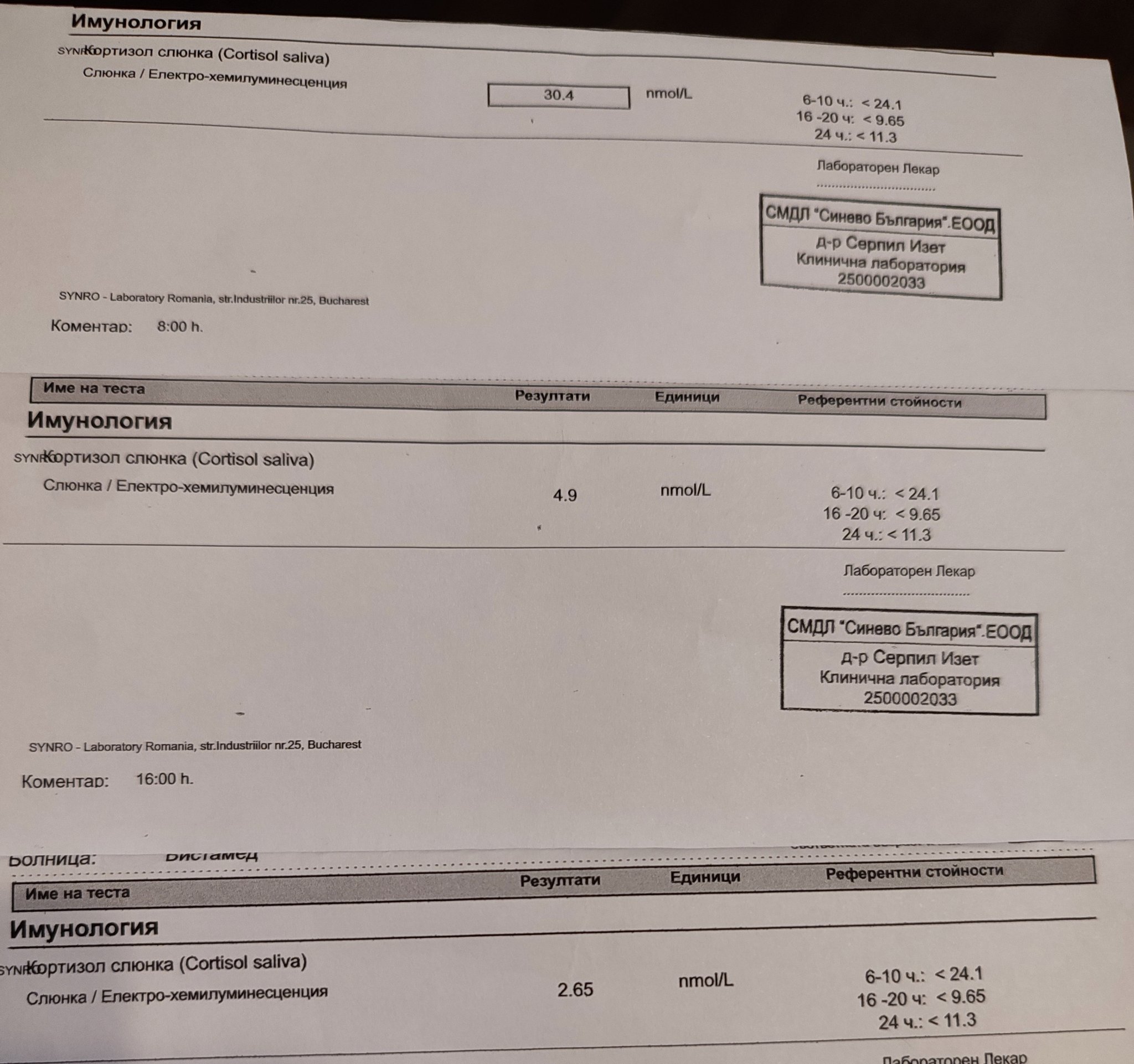 - аз много от кортизол не разбирам и затова не ти коментирам резултатите, само знам, че сутрешен трябва да е най-висок, но мисля, че все пак не трябва да е чак на горна граница и после през деня намалява. Преди време много хвалеха изследването в слюнка, после започнаха да то отричат и сега се шири мнението, че е по-достоверен в кръв.