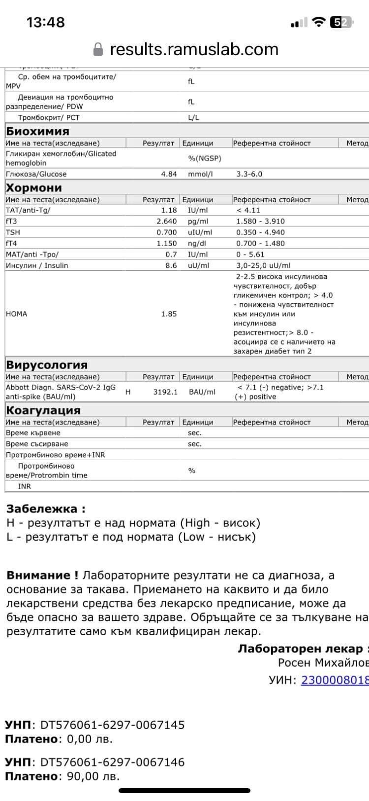 моите изследвания ги правих в Лина в лабораторията, която е в к-с Зорница и са с еднакви параметри -мерки , реф граници, с тези в УСБАЛЕ .Дали толкова бързо могат да се променят стойности ( тук става въпрос за почти трикратно намаление ), не мога да кажа, но още веднъж НЕ вземам никакви хормони/ хапчета, нямала съм никакви стресови ситуации - стандартно ежедневие.