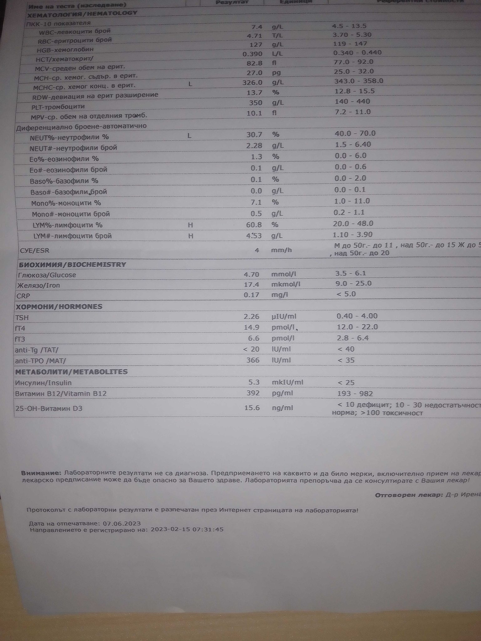 Аз съм от Бургас  и  в четвъртък 1.06 правя TSH -6.65 /  реф .0.27-4.20/ . В понеделник 5.06 БЕЗ без никакви лекарства в УСБАЛЕ TSH -2.60 при същите реф. граници.По аналогичен начин стоят нещата с FT3,  FT4, ASat, ALat, всички видове холестероли.Направо не можах да повярвам, и питам в лабораторията и доц. Томова при която ходя защо е такава разликата? Коментарът беше , че най- вероятно се дължи на  качеството на реактиви/реагенти. И не само при мен има разлика.По същото време на моя колежка дъщерята тествала в Бургас  ( не съм наясно с реф. граници) пролактин 940, при хоспитализация и изследване в УСБАЛЕ е с пролактин 46. Не стига , че няма читави ендокринолози в Бургас , ами и лаболаториите и те ни лъжат. Та за дамите от Бургас преди да започнете да приемате изписаните хормони -отделете време и средства ( Cold Sweat ) и отивайте в София. В противен случай ще ви пати моята - грешна терапия от която вече 9мес не мога до край да се оправя. В личен план - вече всичко с изключение на МАТ ( реф. граници < 34 , при мен 68.11) e  наред и продължавам само с диета, защото ИТМ ми е 27.5 а МАТ бил много зависим от затлъстяването - надявам се да го регулирам.