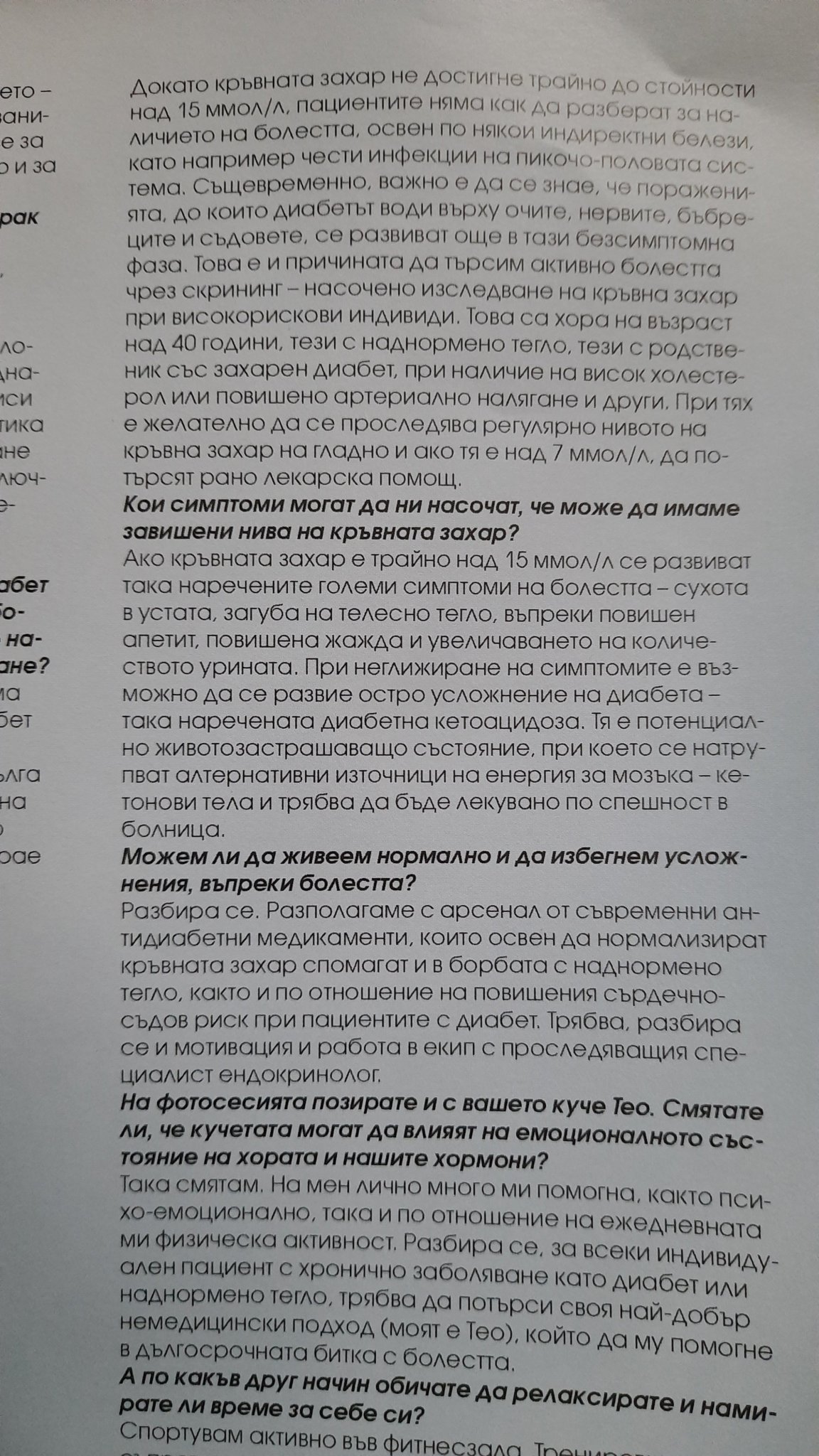 Преди няколко седмици четох интервю с млад ендокринолог, завършил някъде в Европа. С множество награди...Ето част от интервюто; като стигнах до частта, където обяснява колко е важно "рано" да се обърнем към лекар- т.е. след като КЗ на гладно ни е 7 или повече (моята КЗ никога не е била чак 7 на гладно, а симптоми си имах), направо останах безмълвна: