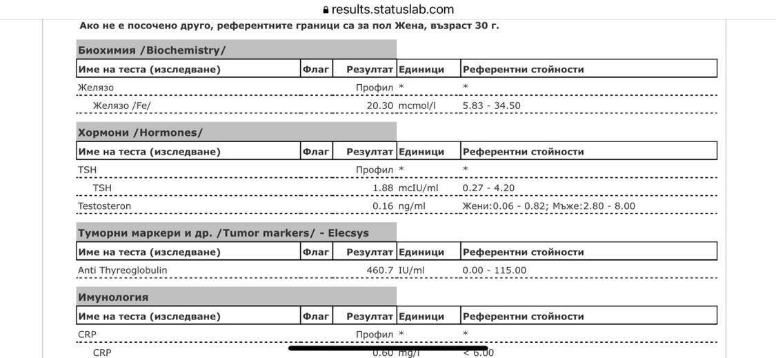 Моят съвет е следващия път да си пуснеш и някои други маркери: Инсулин + Глюкоза (сутрин, на гладно, след 12-часова пауза от последното хранене), Гликиран хемоглобин, Липиден профил, Витамин D, Витамин 12, Хомоцистеин, Фолиева киселина, Феритин, Трансферин, ЖСК, Мед, Цинк, Хлор, Магнезий и т.н.