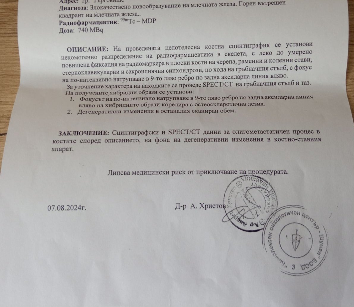 След лечение на рак на гърдата и направиха костна сцинтиграфия и излезе този резултат.