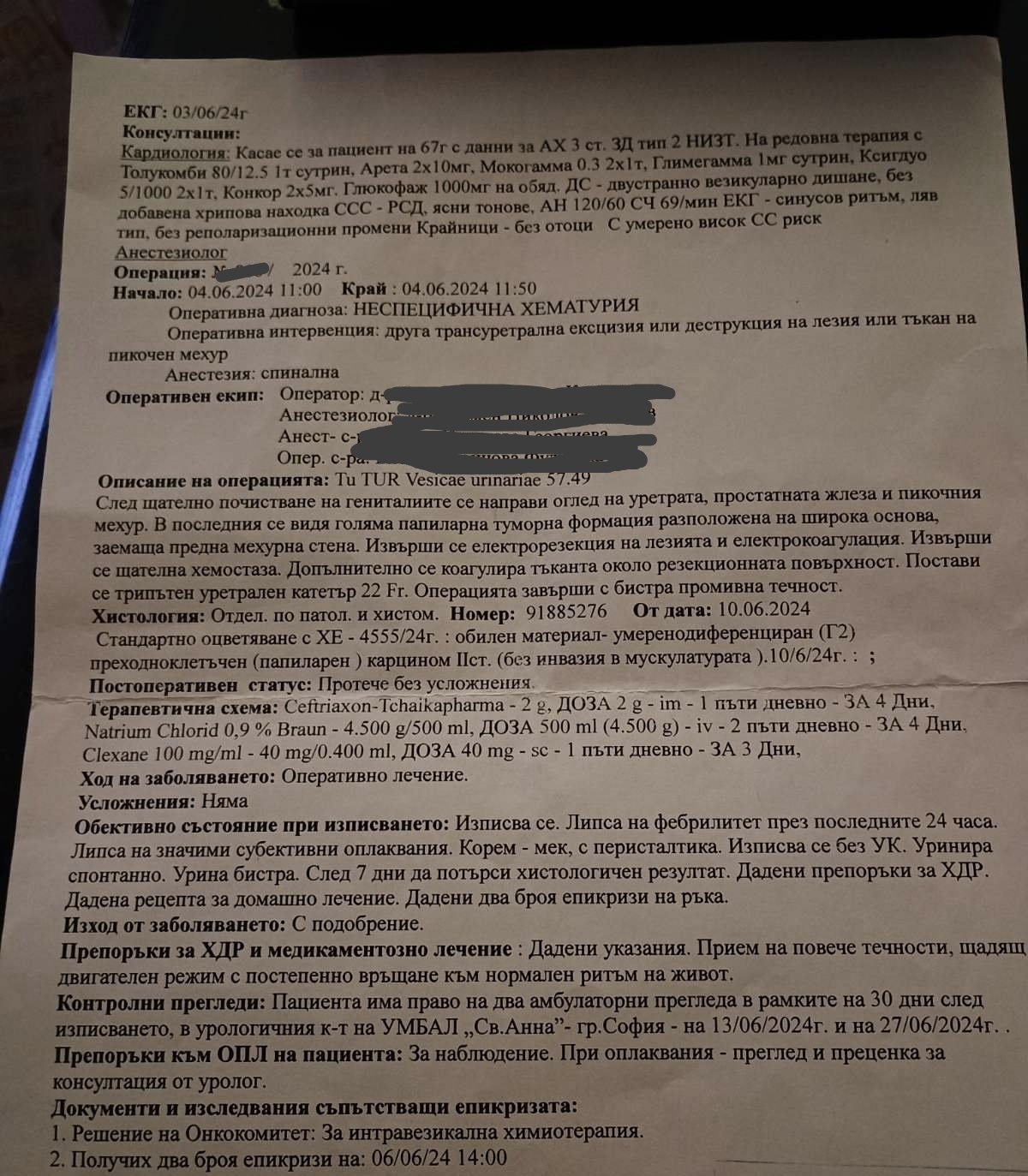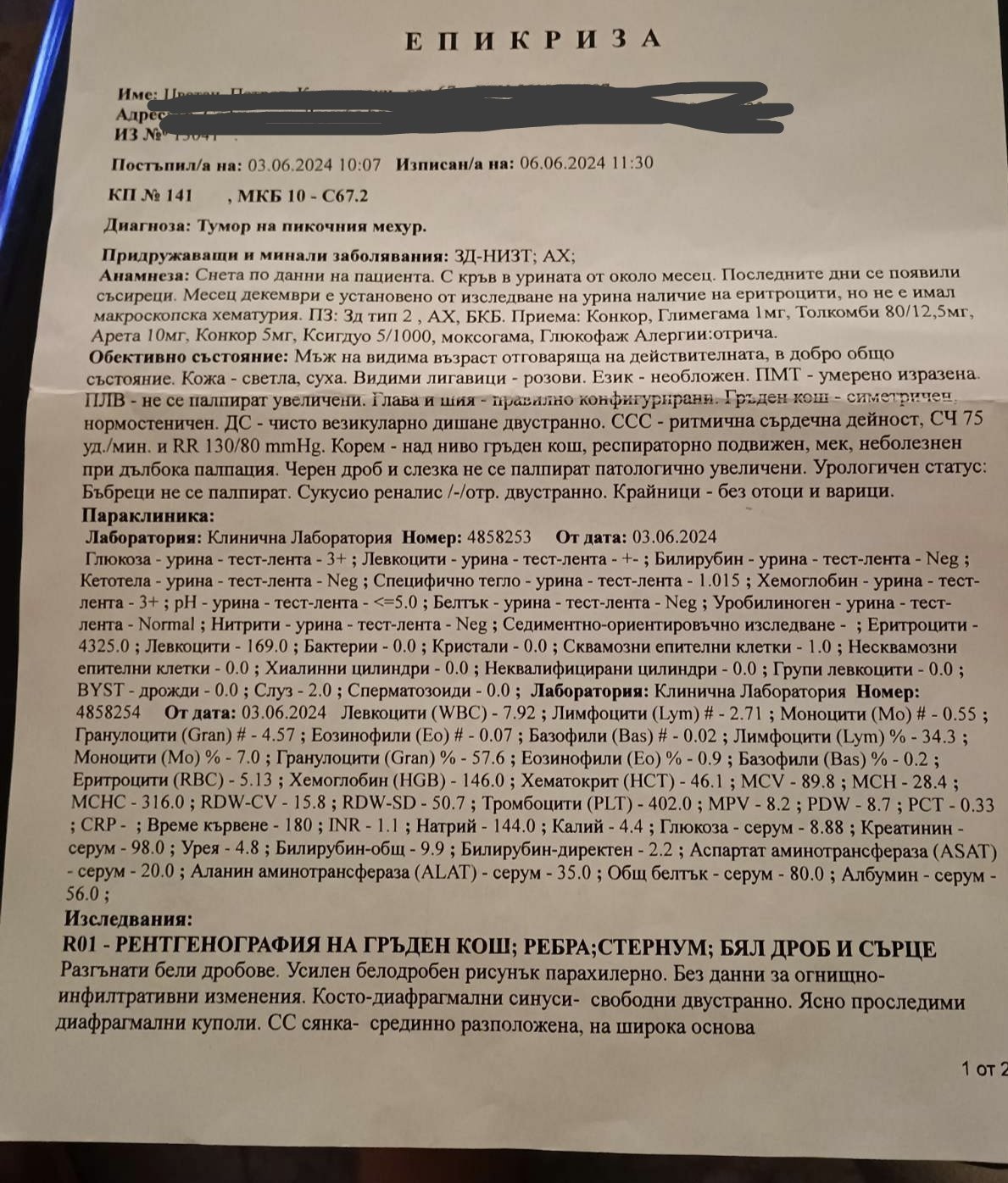 Това са документи от първата операция, втората мина преди 2 седмици. Дали може вече да се направи образно изследване? Не мога да разбера защо не е направено такова преди операцията. И сега го въртят човека, той иска и пита кога ще му направят CT, те увъртат и не му дават отговор.