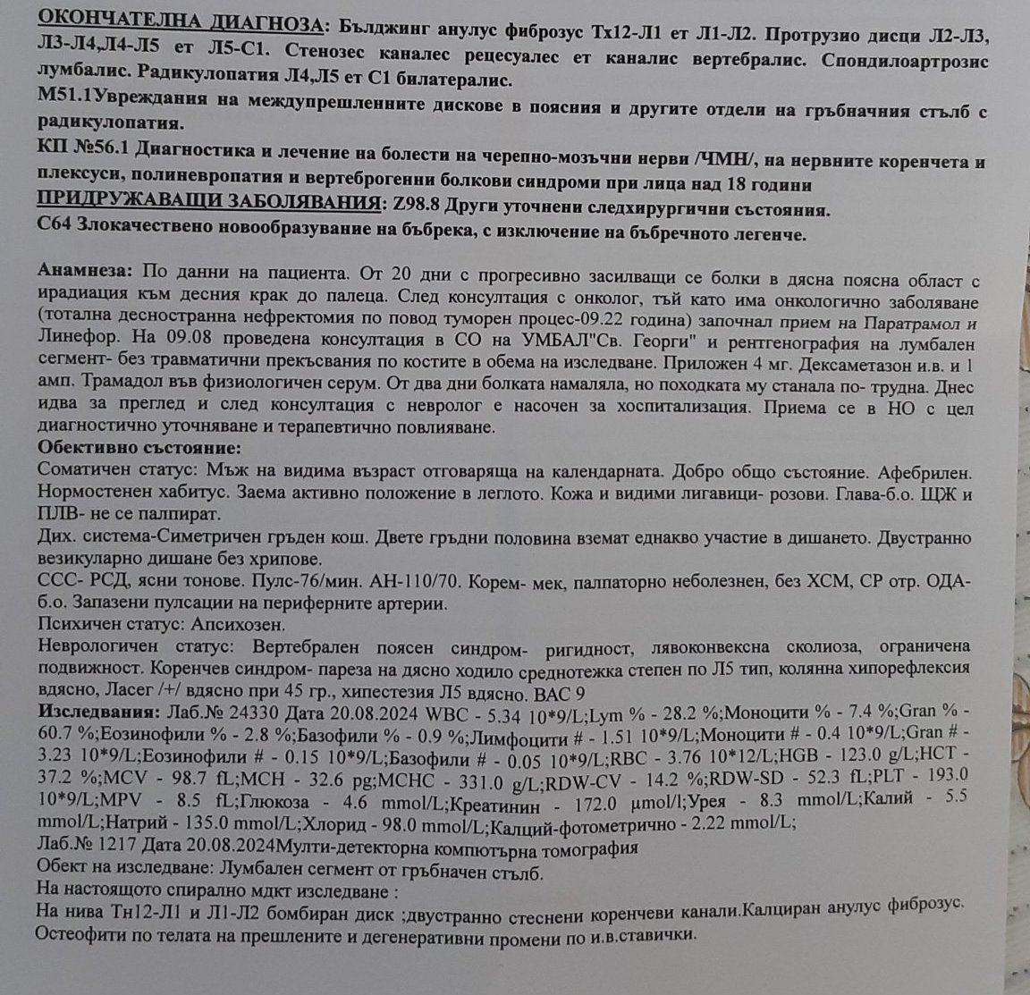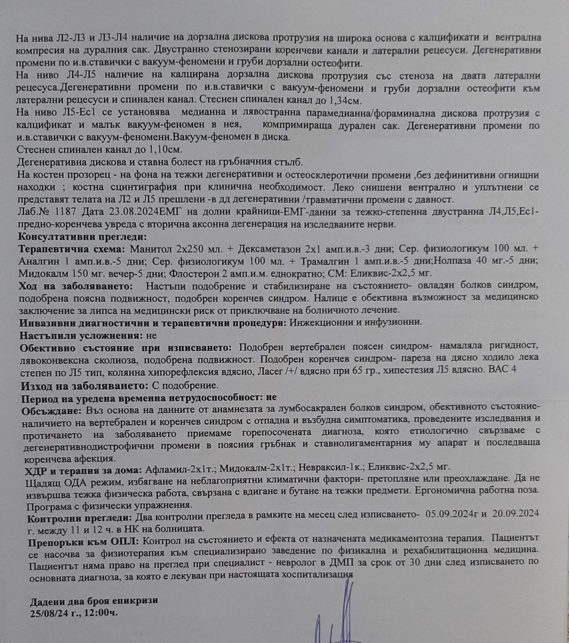 mystic, според мен сте за неврохирург. От L2 до C1 има дискови протрузии на всяко ниво. Предвид болката, ясно е, че има притиснати коренчета. Стеснен е и каналът, което, ако не се третира и продължи дълго време, може да доведе до увреждане на гръбначния мозък. Струва ми се, че вървите към ламинектомия и някакво третиране на засегнатите дискове, но това трябва специалист да каже/прецени. Направете консултация с доц. Минкин (примерно) в Иван Рилски; може и само с епикризата и дисковете от образните изследвания, без болният да присъства.