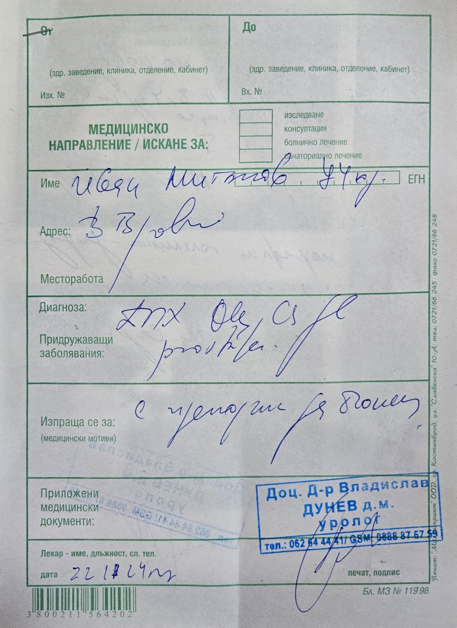 Та.. ходил е на преглед при доц.Дунев, който е казал, че трябва да се направи биопсия на простата и му е дал 2 варианта - с локална анестезия - 15мин, без нужда да остава в болница или прием в болница за 3 дни с пълна упойка.