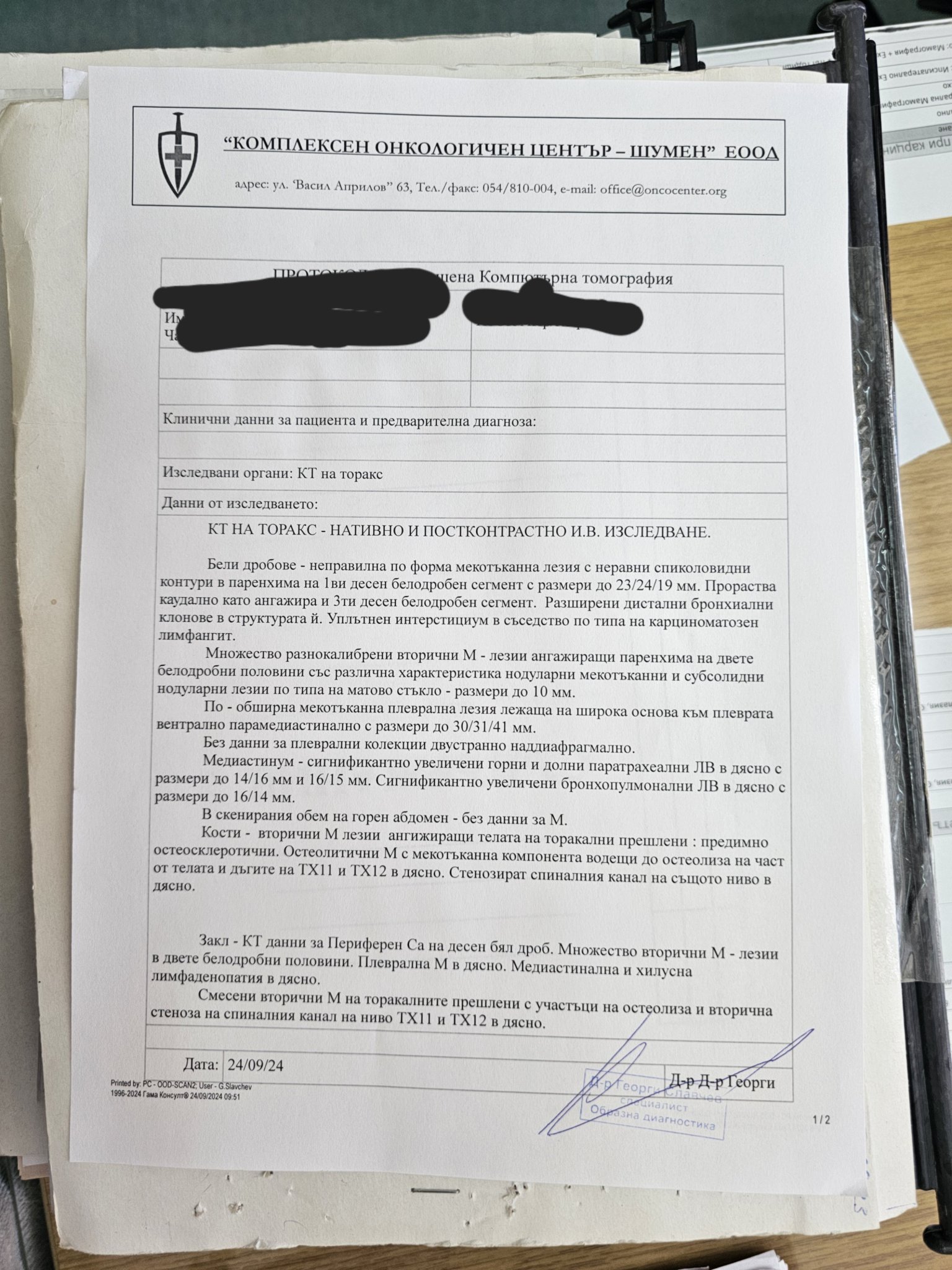 Има КТ, поне това доцента което ни каза като гледа скенер е е че не вижда нищо страшно по гръбнака, само една метастази, която може да махне без проблем и не е инвазивна операция. Майка ми не е за операция по принцип, заради това което изживя с биопсия та но той я успокои. Доц. Тимчева също ни посъветва първо през неврохирург, лосле палеаривна лъчетерапи и после химиотерапия. Доц.Димитър Харитонов е завеждащ в отделението в Плевен.