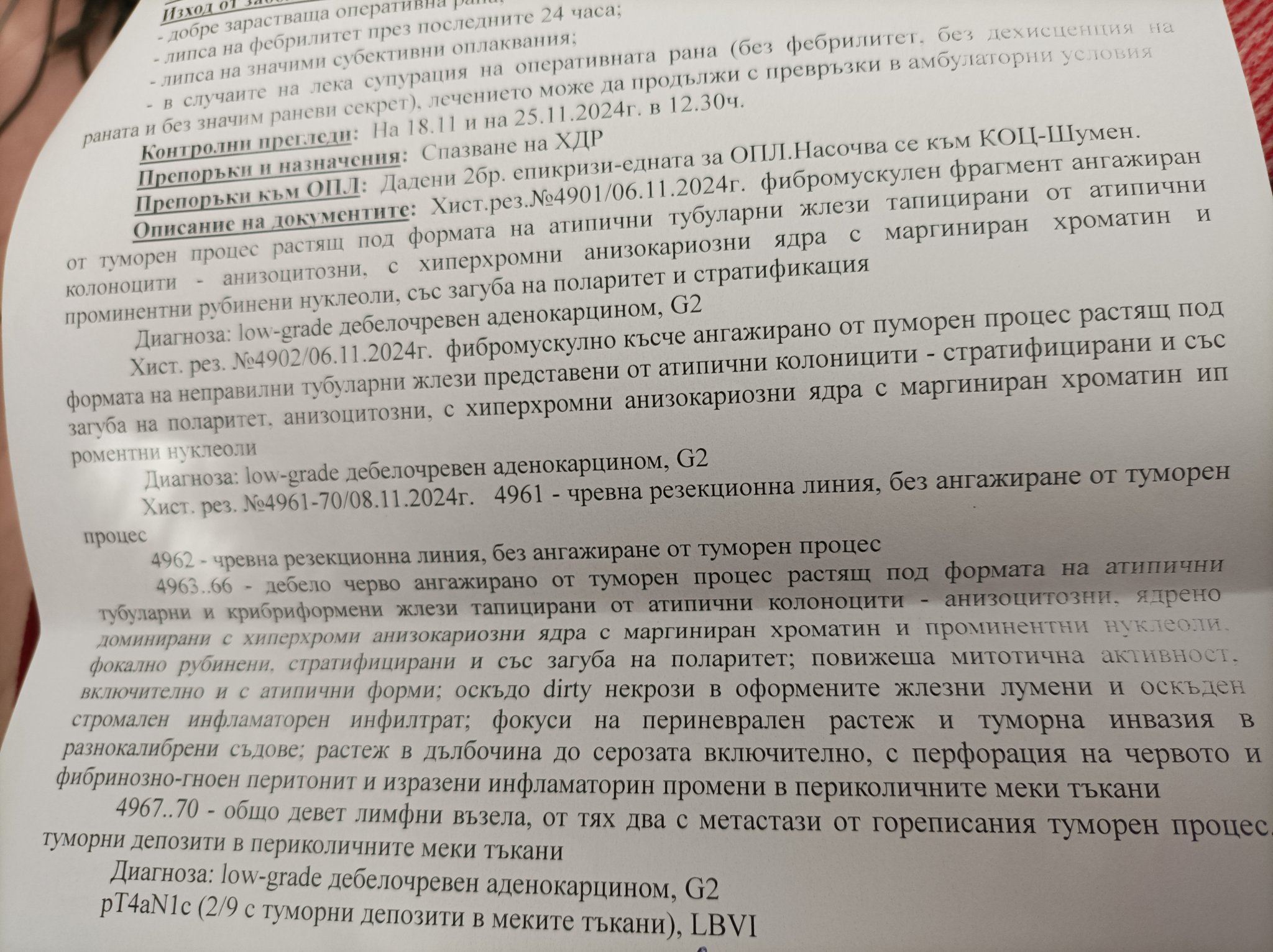 Здравейте, писах в другата тема, но тук е по активно. При мен излезе епикризата. Ще сложа снимки. Ако някой може да каже нещо, но както така. Май нашият лекар няма да оперира. Ще видя и други мнения, но за начало няма да започвам химио и лъче по указания на моя лекар. Ще се консултираме. Тази гад не ми е давала кой знае какви сигнали, за да ме атакува.