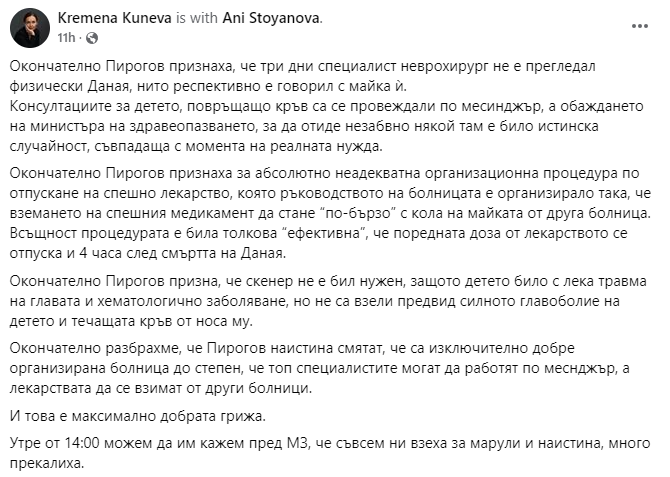 , а че избор няма. Алтернатива на Пирогов няма, особено за много състояния при децата. Но няма и стандарти, контрол, няма нищо. Съжалявам, но и съд няма, защото какво би достигнало до съда, какви доказателства, документи и свидетели? Реално по този начин държавата покровителства порочни, убийствени практики, които реално убиват хора. И не взима никакви мерки против това. Има всякакви хора и срвд лекарите. Както имаме милион истории с щастлив край, има стотици прекрасни Хора, които правят и невъзможното, така има и други. Не сме джунгла, европейска държава сме. Трябва да сме. Не че сме. Явно. Но въпреки че сами се оплитат във фактите, нищо не се случва. Няма последствия. Реално дори и да излязат и да признаят всичко, пак няма да има последствия.