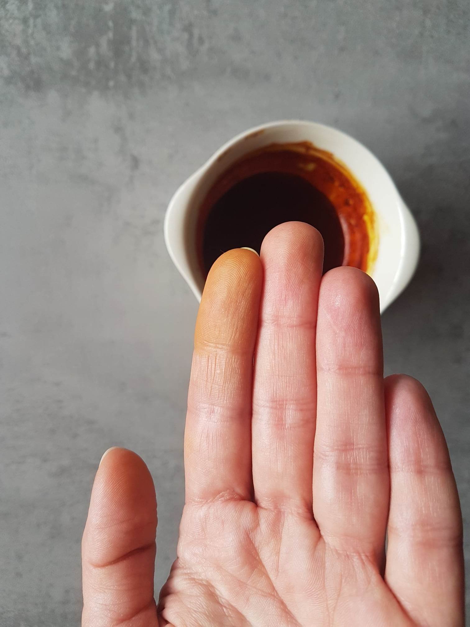 Не знам кой би искал това шафраново жълто в косата си, обаче аз се отказах. Вижда се как е оцветила показалеца ми, а жълтото е отделеният пигмент по края на купичката. И без това имах сериозни съмнения, че камалата дава червен цвят, защото гледах резултата от боядисване на тъкани с нея, ами тя съдържа жълт и оранжев пигмент, откъде да дойде червено...